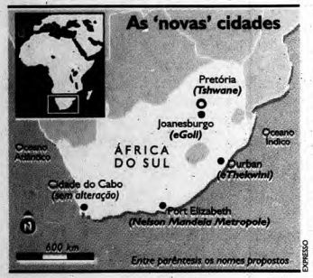 Na costa do Índico, Durban deverá passar a «eThekwini», nome pelo qual já é chamada entre os nativos de etnia zulu.