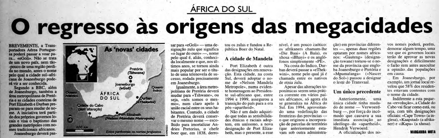 Brevemente, a Transportadora Aérea Portuguesa poderá passar a voar para… «eGoli». Não se trata de um novo país, nem tão-pouco de uma região perdida no mundo, antes o nome pelo qual a cidade sul-africana de Joanesburgo poderá vir a ser conhecida.