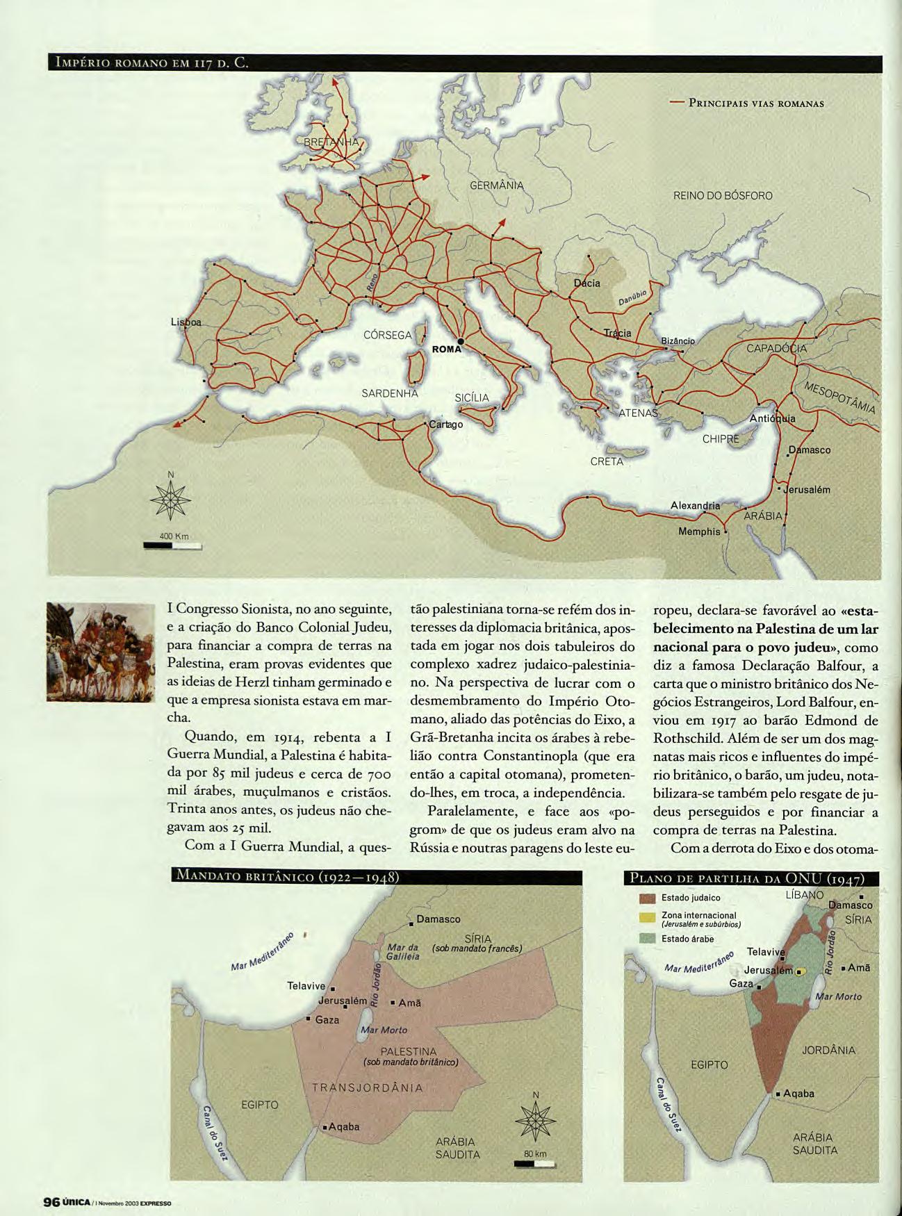 Com a expansão romana pelo Mediterrâneo e a conquista de Jerusalém no ano de 70 da era cristã, a região torna-se uma província do Império, que a baptiza de “Palaestina”, a expressão greco-latina usada primeiramente por Heródoto para se referir à terra dos filisteus. A designação sobrevive à dominação otomana, bem como ao nascimento do islamismo, no século VII. Subordinada à cultura árabe e à fé muçulmana, a Palestina assim permaneceria até inícios do século XX, altura em que, por força das perseguições aos judeus na Rússia e do efeito sedutor que o movimento sionista começa a gerar, a Palestina torna-se o destino eleito por milhares de judeus.