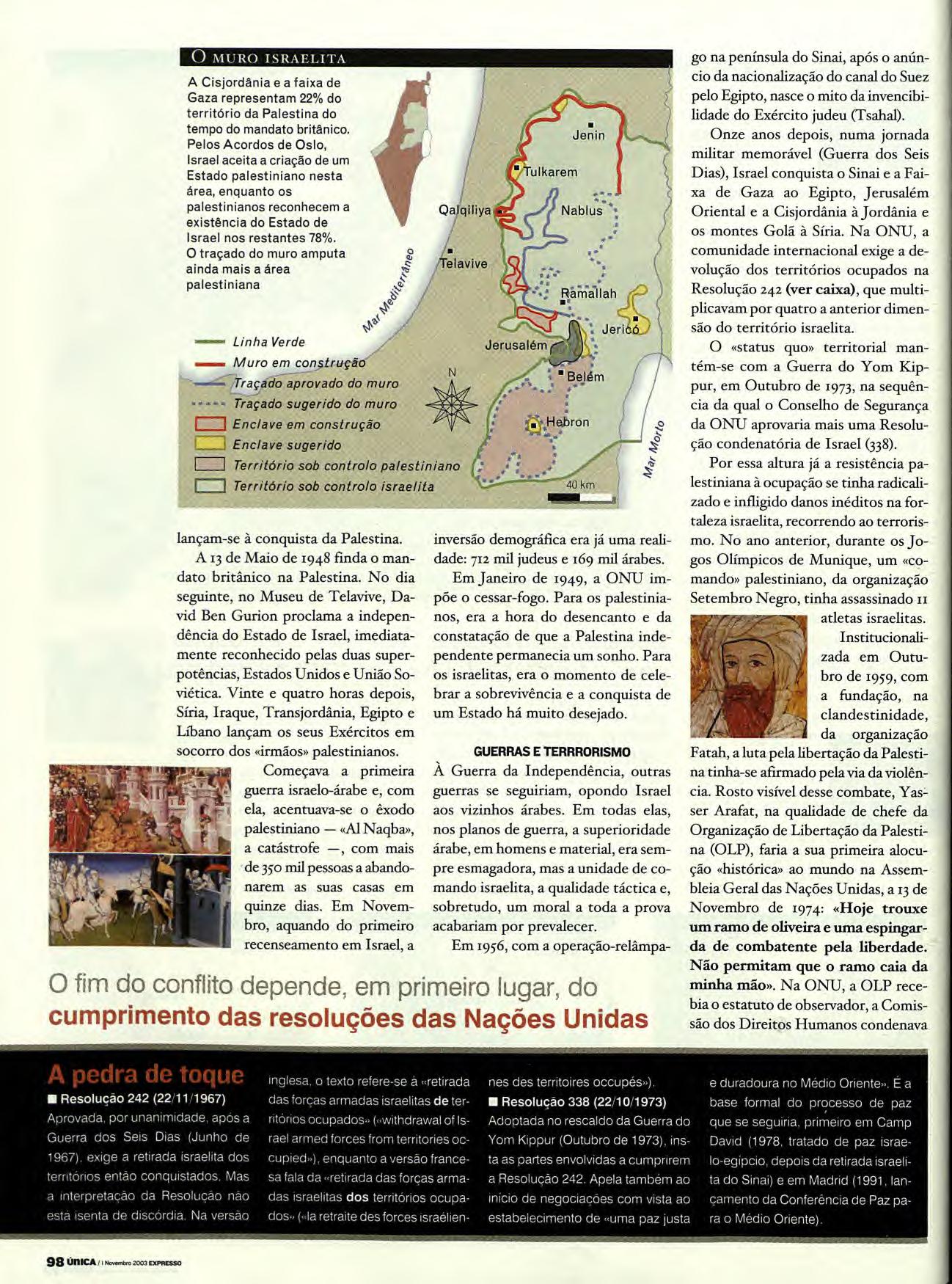 COLONATOS A implantação de colonatos nos territórios ocupados começou logo após a guerra de 1967 e não parou com os Acordos de Oslo. Presentemente, há cerca de 390 mil colonos na Cisjordânia, 7500 na Faixa de Gaza, entre 220 e 250 mil em Jerusalém Oriental e cerca de 17 mil nos montes Golã. Para os palestinianos, os colonatos impedem a formação de um Estado palestiniano viável.