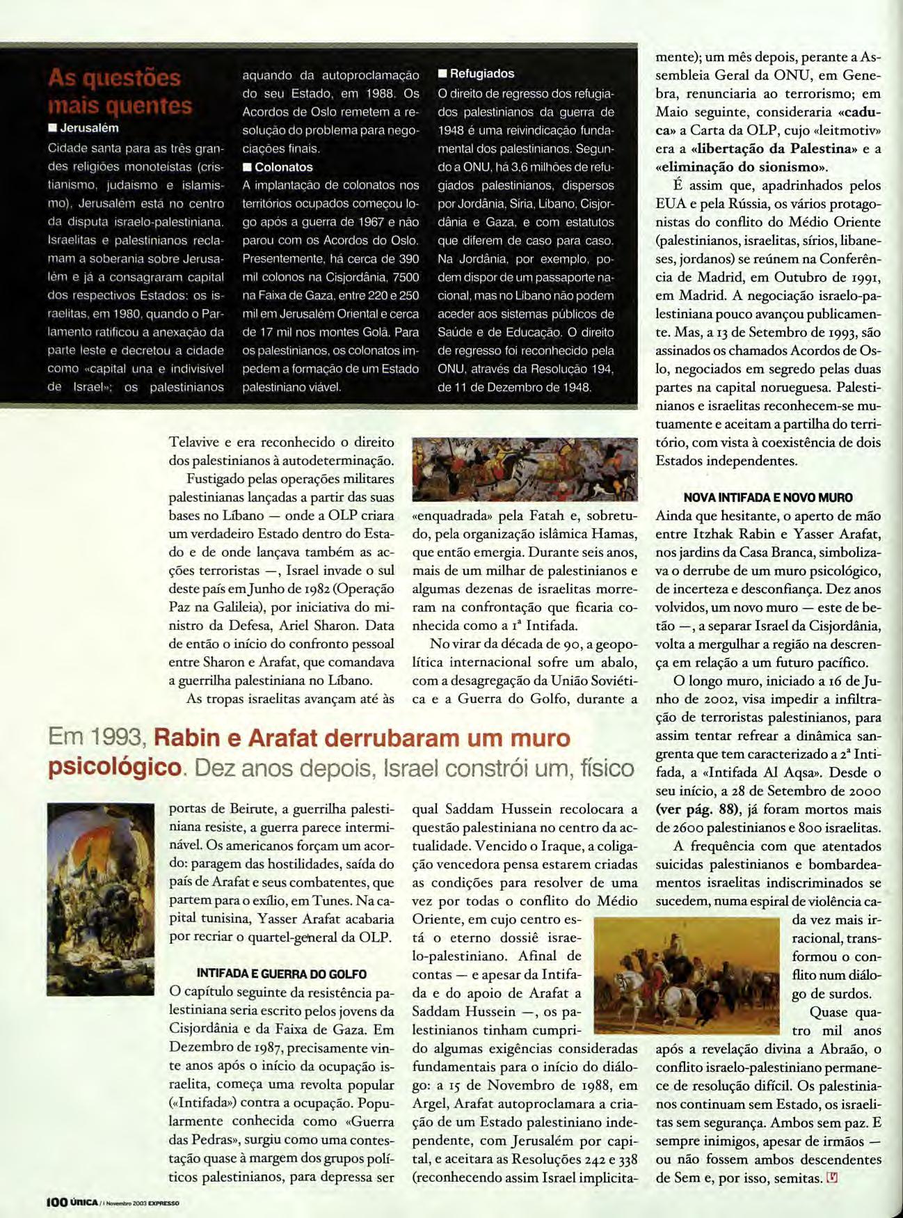 Ainda que hesitante, o aperto de mão entre Itzhak Rabin e Yasser Arafat, nos jardins da Casa Branca, simbolizava o derrube de um muro psicológico, de incerteza e desconfiança. Dez anos volvidos, um novo muro — este de betão —, a separar Israel da Cisjordânia, volta a mergulhar a região na descrença em relação a um futuro pacífico.