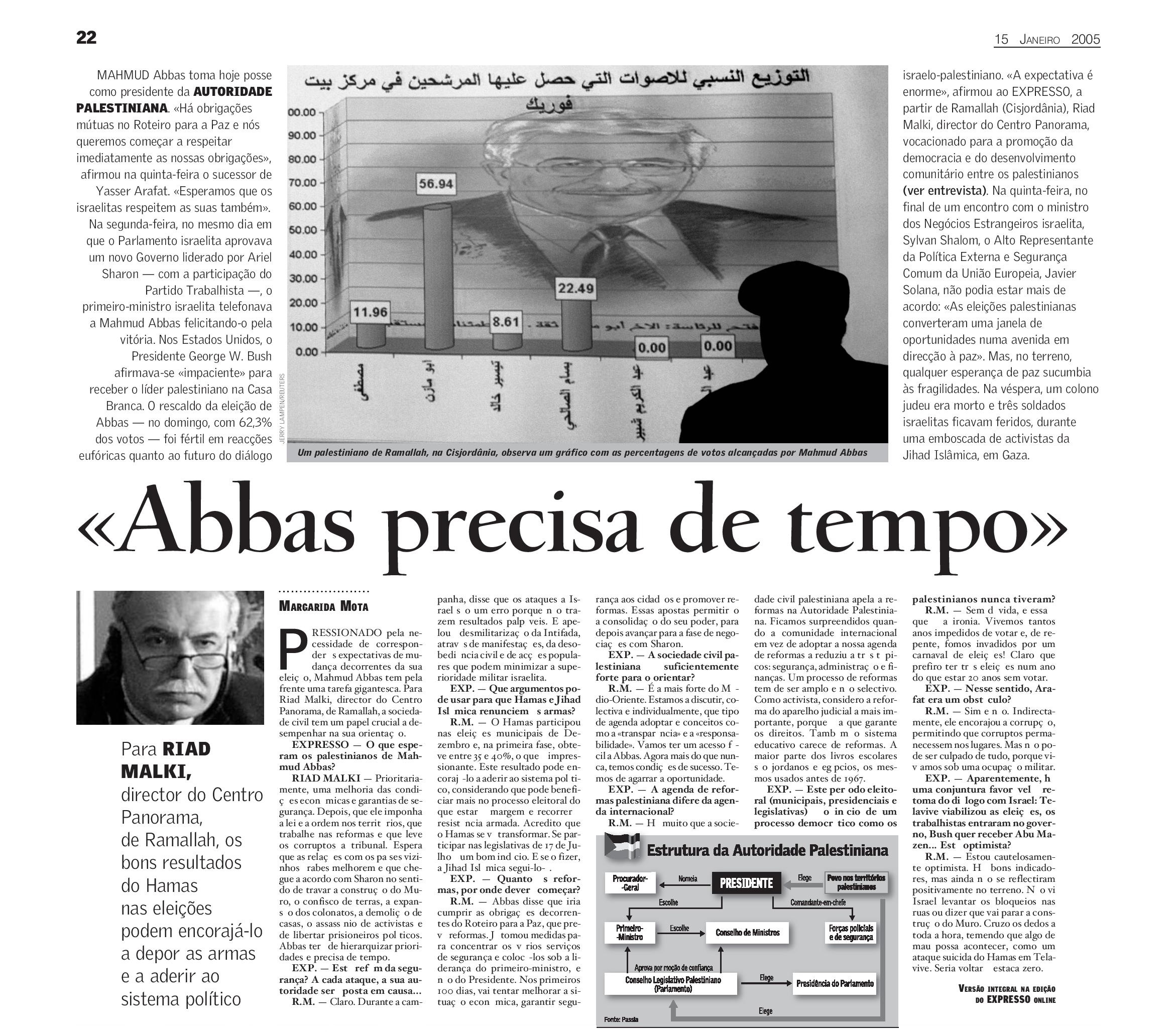 O rescaldo da eleição de Abbas — no domingo, com 62,3% dos votos — foi fértil em reacções eufóricas quanto ao futuro do diálogo israelo-palestiniano. “A expectativa é enorme”, afirmou ao “Expresso”, a partir de Ramallah (Cisjordânia), Riad Malki, director do Centro Panorama, vocacionado para a promoção da democracia e do desenvolvimento comunitário entre os palestinianos.