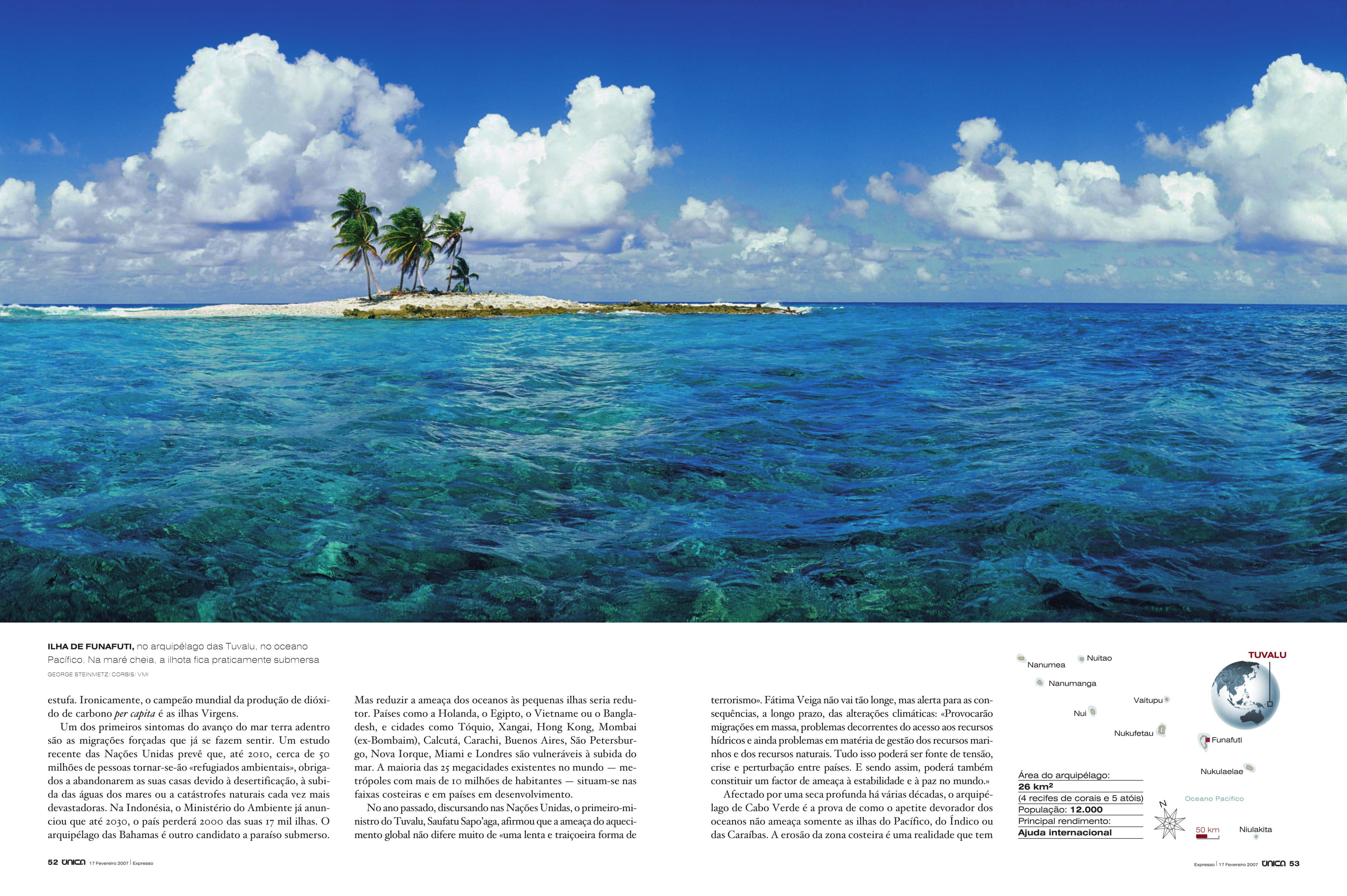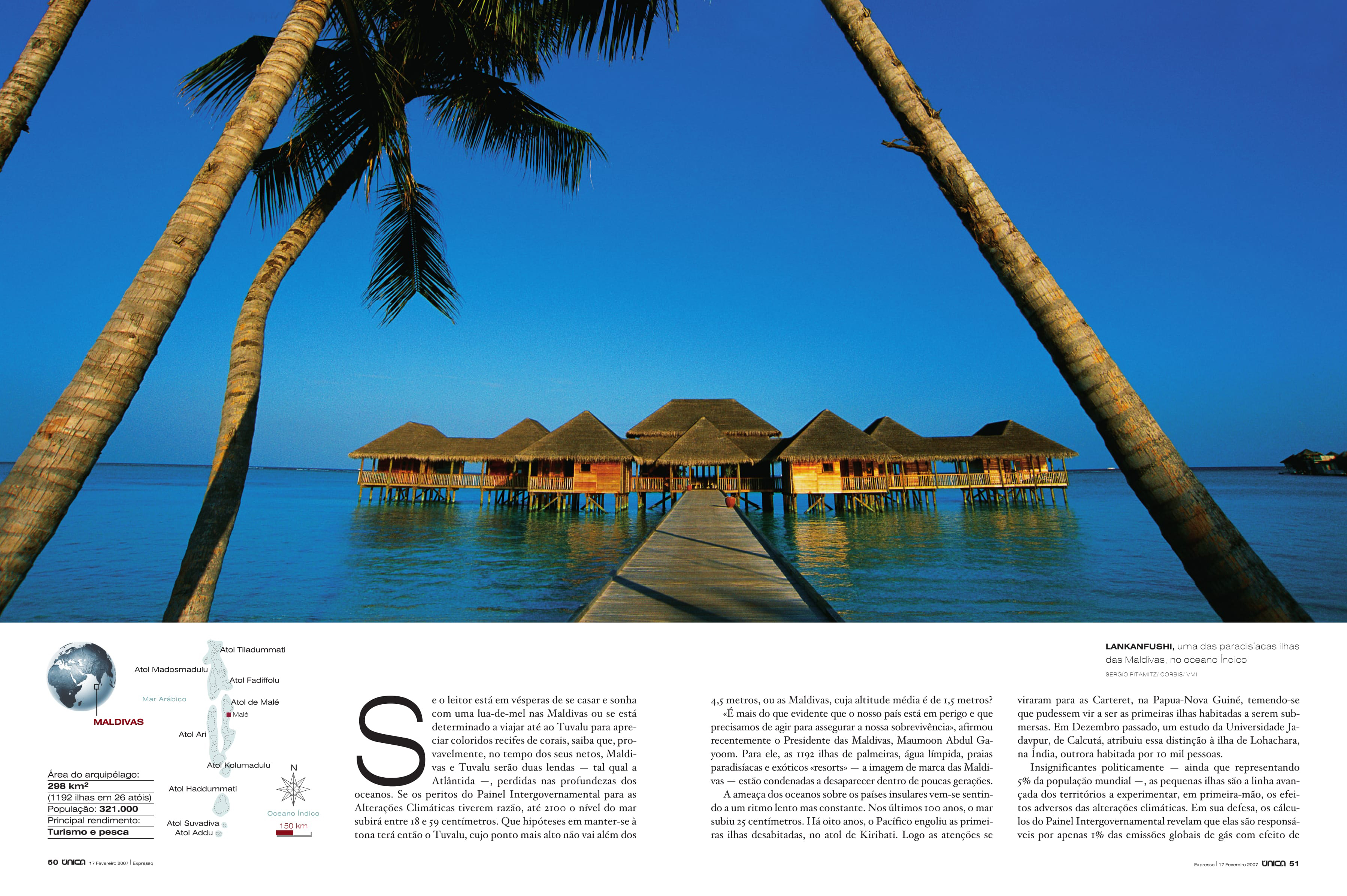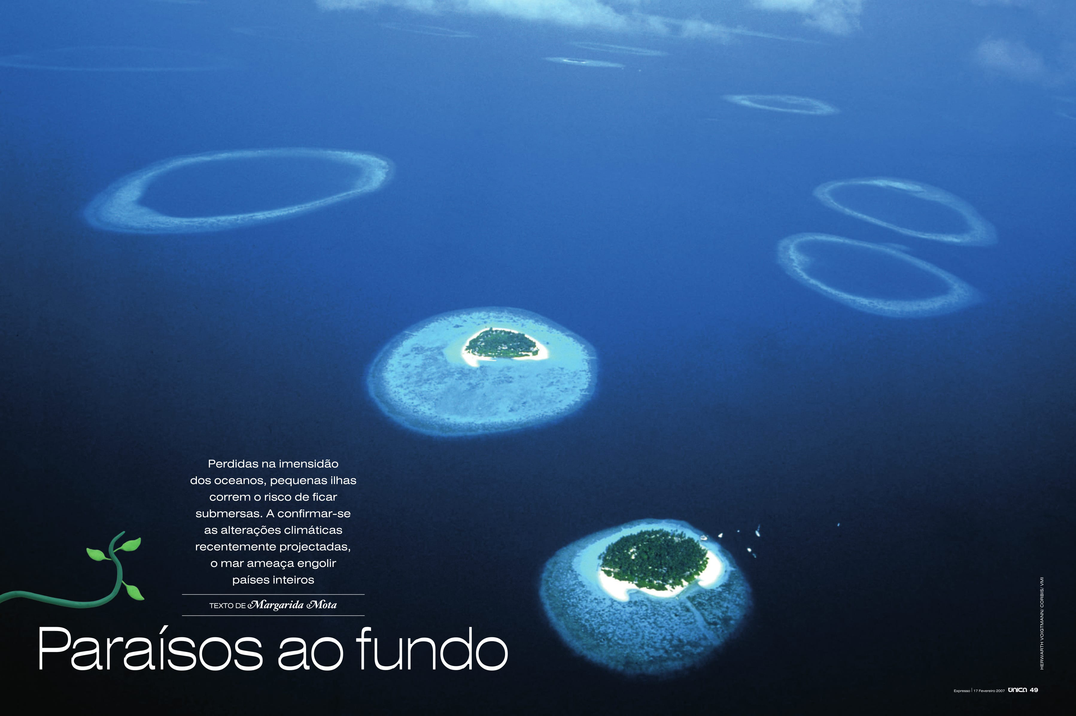 Se o leitor está em vésperas de se casar e sonha com uma lua-de-mel nas Maldivas ou se está determinado a viajar até ao Tuvalu para apreciar coloridos recifes de corais, saiba que, provavelmente, no tempo dos seus netos, Maldivas e Tuvalu serão duas lendas — tal qual a Atlântida —, perdidas nas profundezas dos oceanos. Se os peritos do Painel Intergovernamental para as Alterações Climáticas tiverem razão, até 2100 o nível do mar subirá entre 18 e 59 centímetros. Que hipóteses em manter-se à tona terá então o Tuvalu, cujo ponto mais alto não vai além dos 4,5 metros, ou as Maldivas, cuja altitude média é de 1,5 metros?