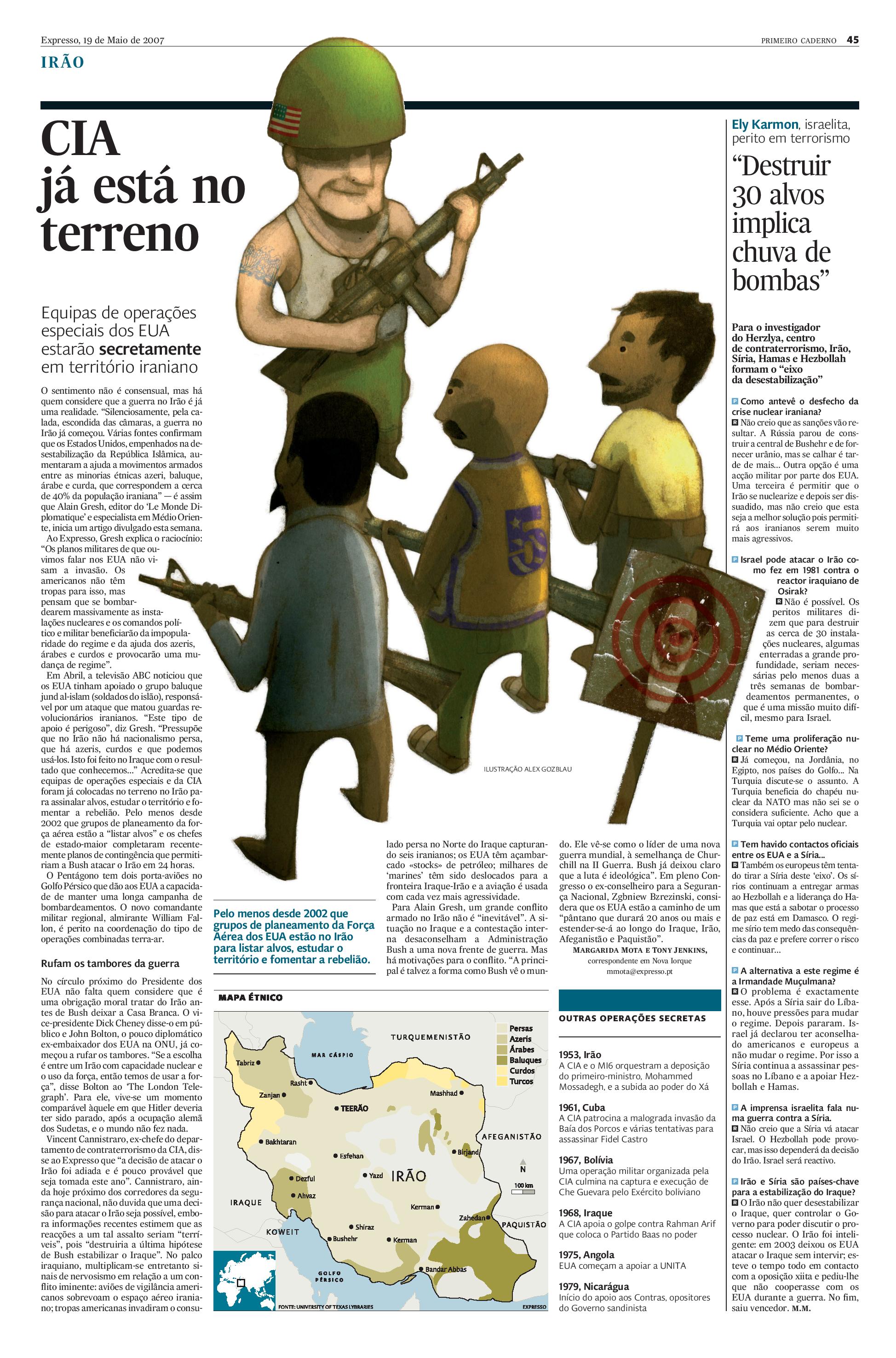 Vincent Cannistraro, ex-chefe do departamento de contraterrorismo da CIA, disse ao Expresso que “a decisão de atacar o Irão foi adiada e é pouco provável que seja tomada este ano”. Cannistraro, ainda hoje próximo dos corredores da segurança nacional, não duvida que uma decisão para atacar o Irão seja possível, embora informações recentes estimem que as reacções a um tal assalto seriam “terríveis”, pois “destruiria a última hipótese de Bush estabilizar o Iraque”. No palco iraquiano, multiplicam-se entretanto sinais de nervosismo em relação a um conflito iminente: aviões de vigilância americanos sobrevoam o espaço aéreo iraniano; tropas americanas invadiram o consulado persa no Norte do Iraque capturando seis iranianos; os EUA têm açambarcado “stocks” de petróleo; milhares de ‘marines’ têm sido deslocados para a fronteira Iraque-Irão e a aviação é usada com cada vez mais agressividade.