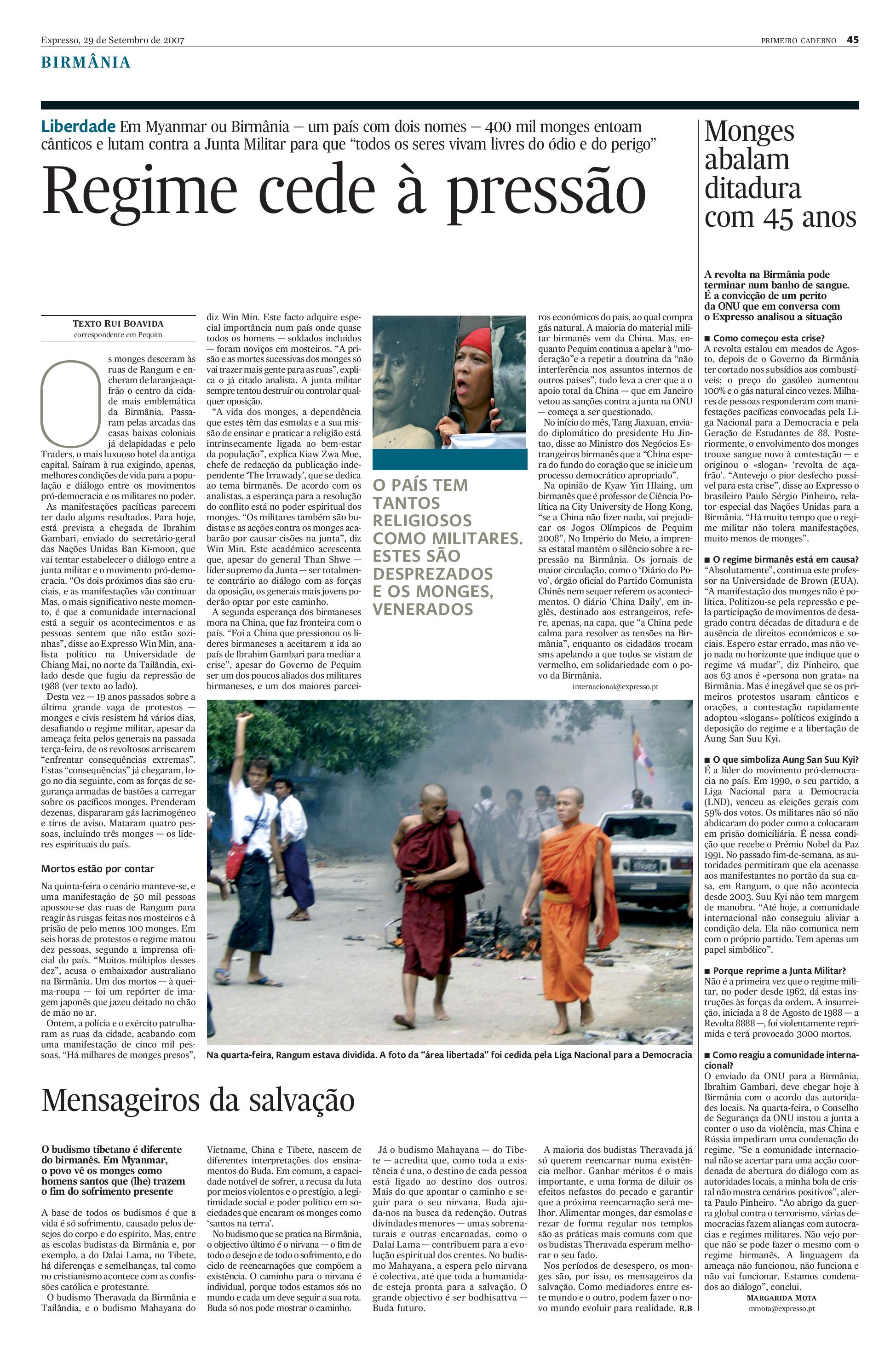 A revolta estalou em meados de Agosto, depois de o Governo da Birmânia ter cortado nos subsídios aos combustíveis; o preço do gasóleo aumentou 100% e o gás natural cinco vezes. Milhares de pessoas responderam com manifestações pacíficas convocadas pela Liga Nacional para a Democracia e pela Geração de Estudantes de 88. Posteriormente, o envolvimento dos monges trouxe sangue novo à contestação — e originou o “slogan” ‘revolta de açafrão’. “Antevejo o pior desfecho possível para esta crise”, disse ao Expresso o brasileiro Paulo Sérgio Pinheiro, relator especial das Nações Unidas para a Birmânia. “Há muito tempo que o regime militar não tolera manifestações, muito menos de monges”.