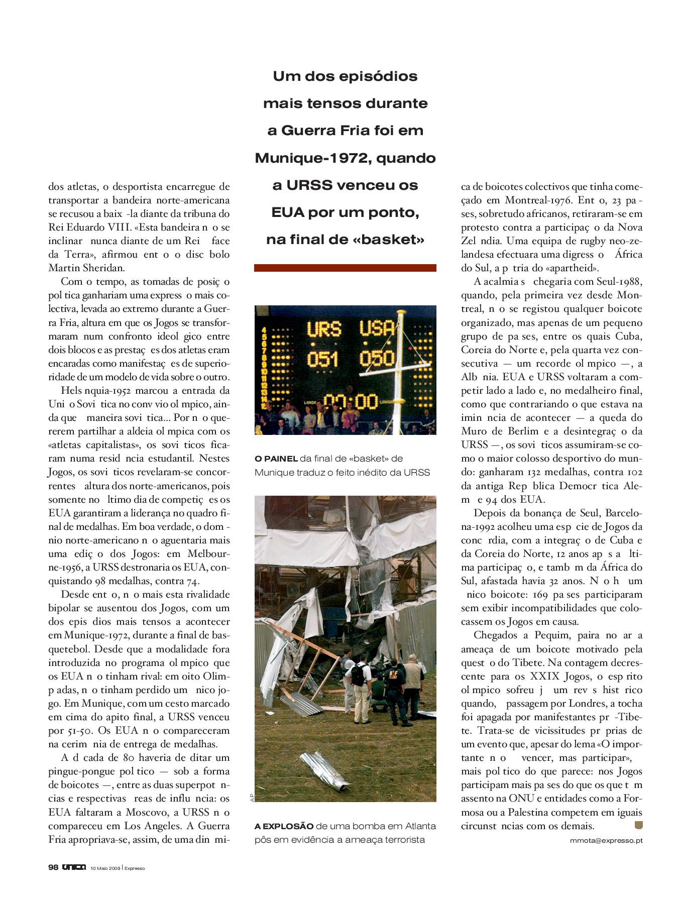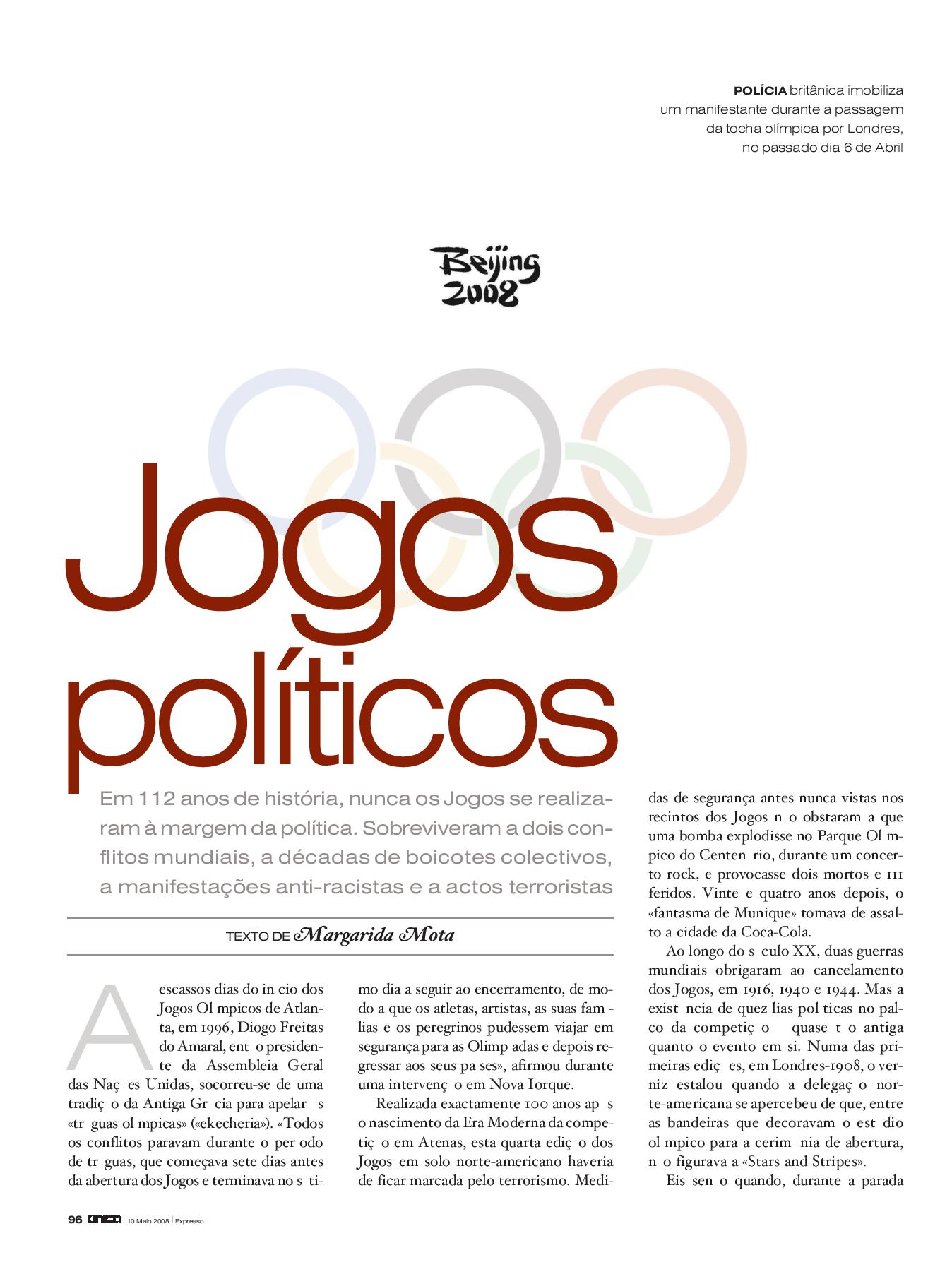 Chegados a Pequim, paira no ar a ameaça de um boicote motivado pela questão do Tibete. Na contagem decrescente para os XXIX Jogos, o espírito olímpico sofreu já um revés histórico quando, à passagem por Londres, a tocha foi apagada por manifestantes pró-Tibete. Trata-se de vicissitudes próprias de um evento que, apesar do lema “O importante não é vencer, mas participar”, é mais político do que parece: nos Jogos participam mais países do que os que têm assento na ONU e entidades como a Formosa ou a Palestina competem em iguais circunstâncias com os demais.