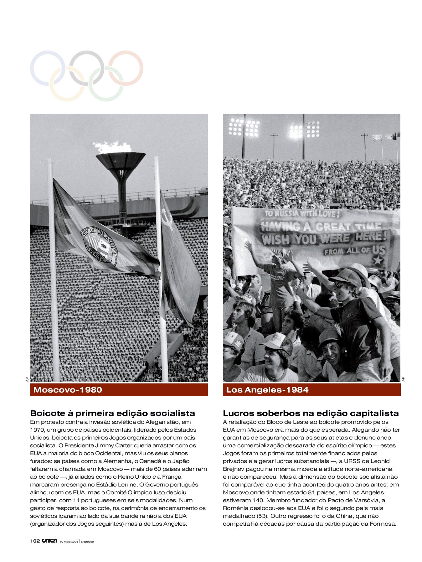 MOSCOVO-1980 Boicote à primeira edição socialista Em protesto contra a invasão soviética do Afeganistão, em 1979, um grupo de países ocidentais, liderado pelos Estados Unidos, boicota os primeiros Jogos organizados por um país socialista. O Presidente Jimmy Carter queria arrastar com os EUA a maioria do bloco Ocidental, mas viu os seus planos furados: se países como a Alemanha, o Canadá e o Japão faltaram à chamada em Moscovo — mais de 60 países aderiram ao boicote —, já aliados como o Reino Unido e a França marcaram presença no Estádio Lenine. O Governo português alinhou com os EUA, mas o Comité Olímpico luso decidiu participar, com 11 portugueses em seis modalidades. Num gesto de resposta ao boicote, na cerimónia de encerramento os soviéticos içaram ao lado da sua bandeira não a dos EUA (organizador dos Jogos seguintes) mas a de Los Angeles.