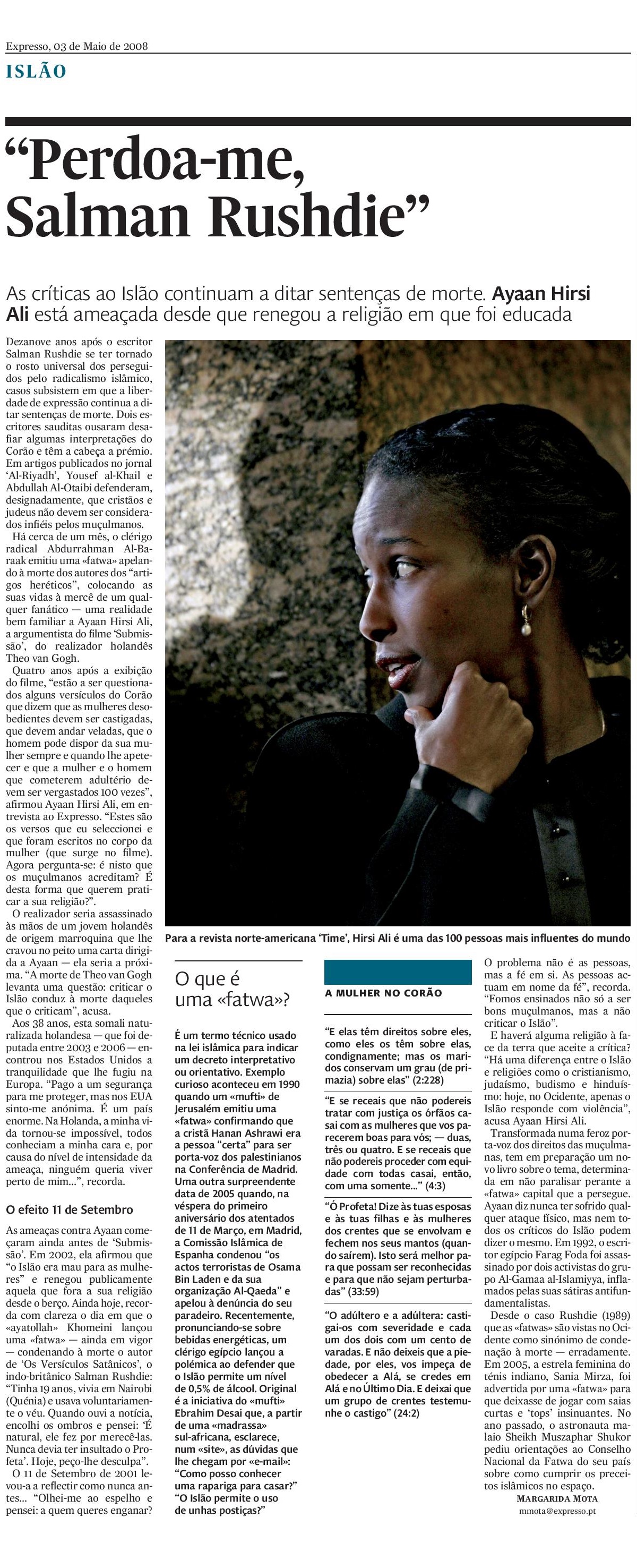 As ameaças contra Ayaan começaram ainda antes de ‘Submissão’. Em 2002, ela afirmou que “o Islão era mau para as mulheres” e renegou publicamente aquela que fora a sua religião desde o berço. Ainda hoje, recorda com clareza o dia em que o “ayatollah” Khomeini lançou uma “fatwa” — ainda em vigor — condenando à morte o autor de ‘Os Versículos Satânicos’, o indo-britânico Salman Rushdie: “Tinha 19 anos, vivia em Nairobi (Quénia) e usava voluntariamente o véu. Quando ouvi a notícia, encolhi os ombros e pensei: ‘É natural, ele fez por merecê-las. Nunca devia ter insultado o Profeta’. Hoje, peço-lhe desculpa”.