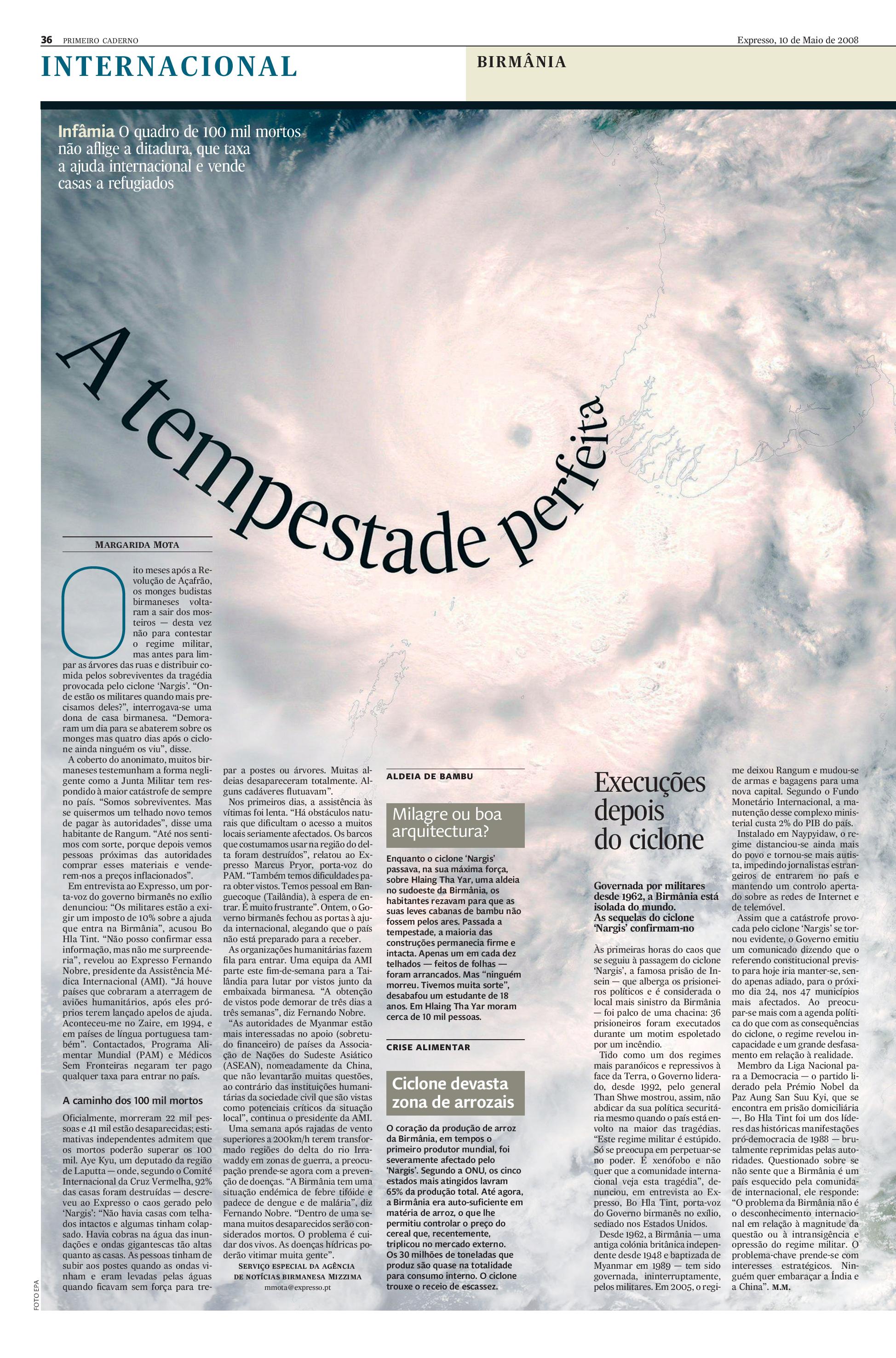 Oficialmente, morreram 22 mil pessoas e 41mil estão desaparecidas; estimativas independentes admitem que os mortos poderão superar os 100 mil. Aye Kyu, um deputado da região de Laputta — onde, segundo o Comité Internacional da Cruz Vermelha, 92% das casas foram destruídas — descreveu ao Expresso o caos gerado pelo ‘Nargis’: “Não havia casas com telhados intactos e algumas tinham colapsado. Havia cobras na água das inundações e ondas gigantescas tão altas quanto as casas. As pessoas tinham de subir aos postes quando as ondas vinham e eram levadas pelas águas quando ficavam sem força para trepar a postes ou árvores. Muitas aldeias desapareceram totalmente. Alguns cadáveres flutuavam”.