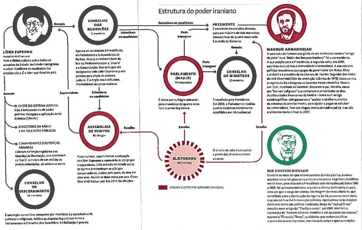 O factor perturbador da sua candidatura situa-se, porém, à retaguarda. Mousavi é apoiado por aquele que é considerado a “eminência parda” do regime iraniano — o ayatollah Akbar Hashemi Rafsanjani, de 75 anos, Presidente do Irão entre 1989 e 1997 e antigo confidente do ayatollah Ruhollah Khomeini, o fundador da República Islâmica do Irão. Na pirâmide do poder, Rafsanjani detém a presidência de duas instituições (ver infografia), sendo considerado a segunda figura mais poderosa do país. Tal não impediu, porém, que, esta semana, a Justiça proibisse dois dos seus filhos de saírem do país, por “incitamento e organização de manifestações ilegais”, anunciou, na quinta-feira, a agência iraniana Fars.