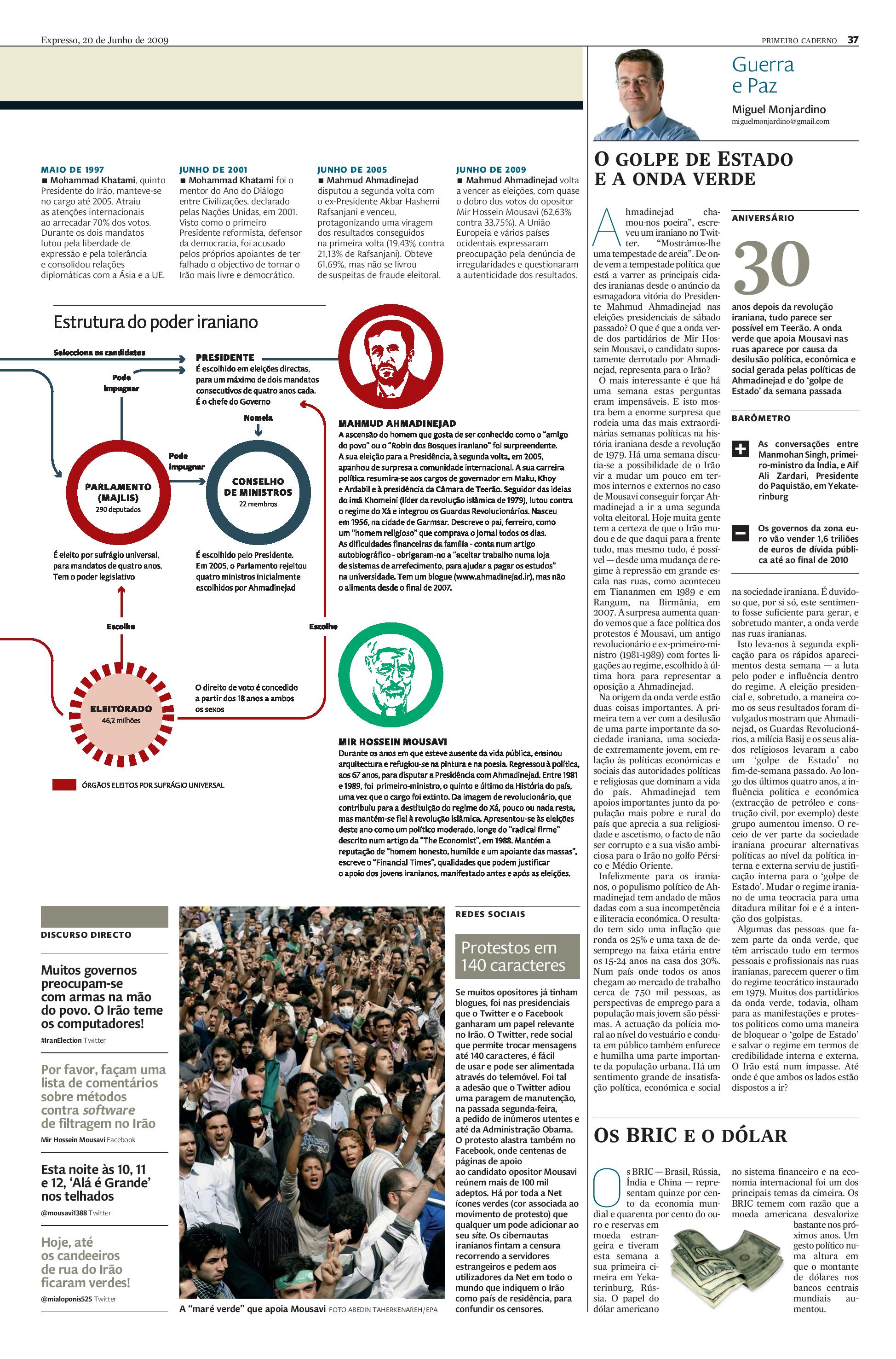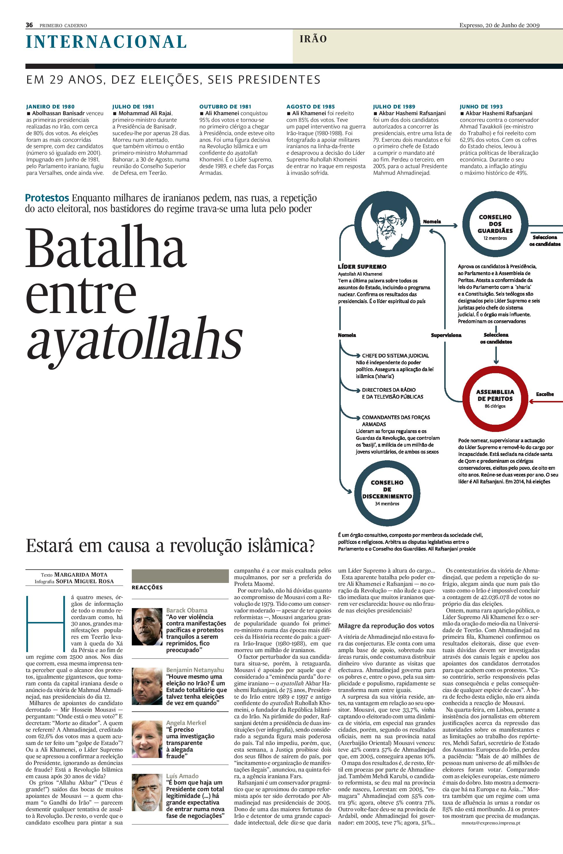 Milhares de apoiantes do candidato derrotado — Mir Hossein Mousavi — perguntam: “Onde está o meu voto?” E decretam: “Morte ao ditador”. A quem se referem? A Ahmadinejad, creditado com 62,6% dos votos mas a quem acusam de ter feito um “golpe de Estado”? Ou a Ali Khamenei, o Líder Supremo que se apressou a confirmar a reeleição do Presidente, ignorando as denúncias de fraude? Está a Revolução Islâmica em causa após 30 anos de vida?