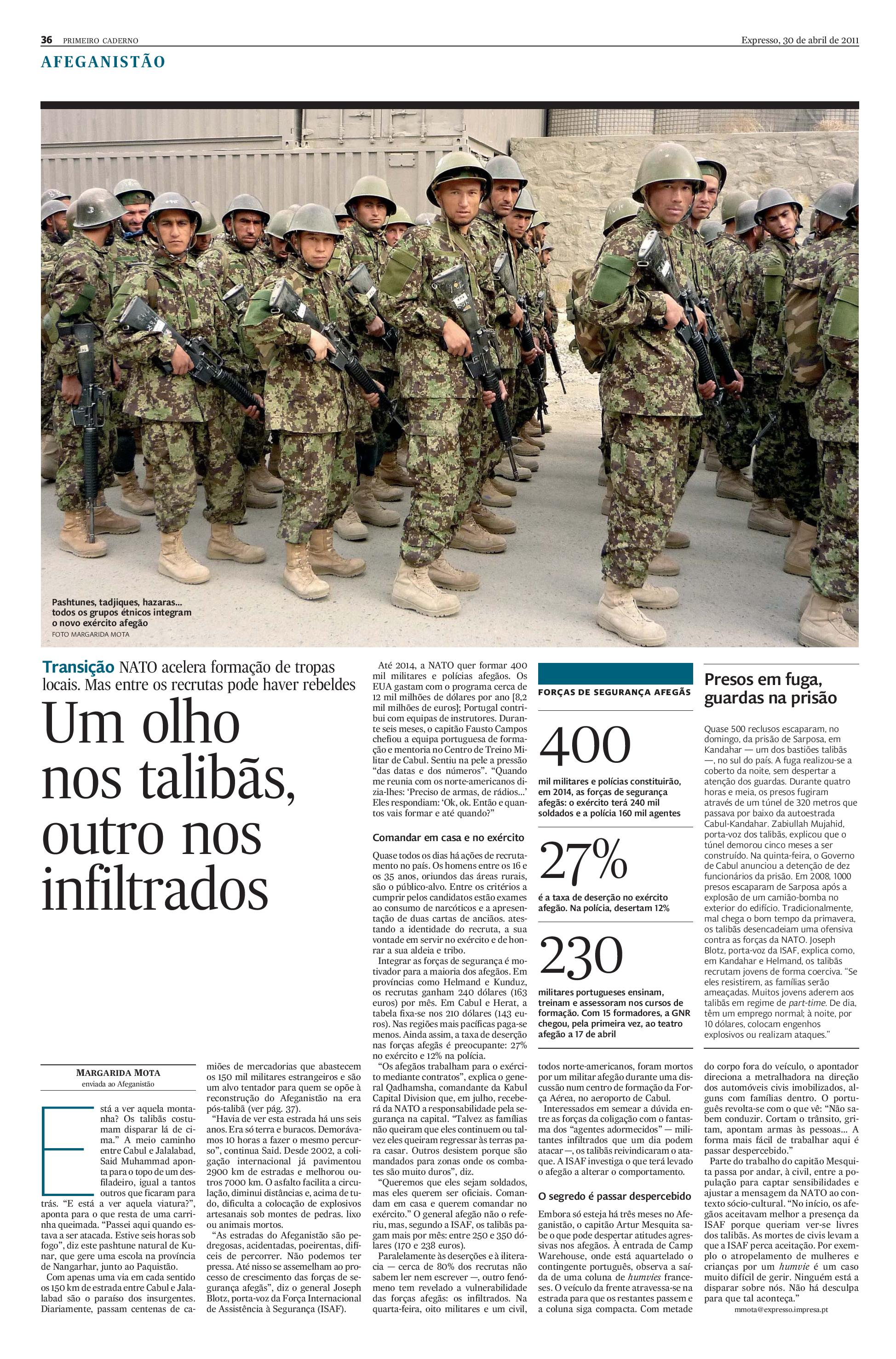Até 2014, a NATO quer formar 400 mil militares e polícias afegãos. Os EUA gastam com o programa cerca de 12 mil milhões de dólares por ano [8,2 mil milhões de euros]; Portugal contribui com equipas de instrutores. Durante seis meses, o capitão Fausto Campos chefiou a equipa portuguesa de formação e mentoria no Centro de Treino Militar de Cabul. Sentiu na pele a pressão “das datas e dos números”. “Quando me reunia com os norte-americanos dizia-lhes: ‘Preciso de armas, de rádios…’ Eles respondiam: ‘Ok, ok. Então e quantos vais formar e até quando?”