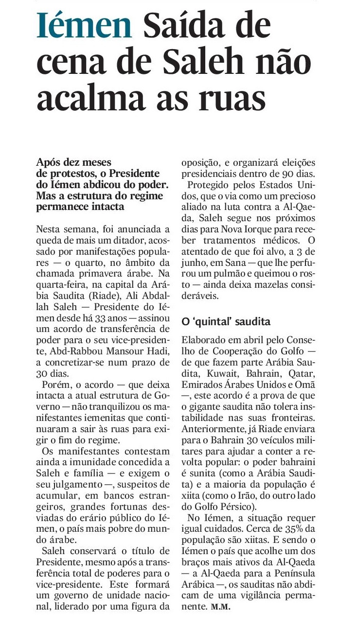 Nesta semana, foi anunciada a queda de mais um ditador, acossado por manifestações populares — o quarto, no âmbito da chamada Primavera Árabe. Na quarta-feira, na capital da Arábia Saudita (Riade), Ali Abdullah Saleh — Presidente do Iémen desde há 33 anos — assinou um acordo de transferência de poder para o seu vice-presidente, Abd Rabbuh Mansur al-Hadi, a concretizar-se num prazo de 30 dias.