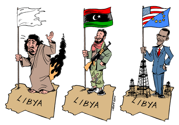 As dores de cabeça de Muammar Kadhadi começaram a 15 de fevereiro quando — já com os “irmãos” Ben Ali e Mubarak fora de cena — protestos populares centrados na Praça Verde, em Tripoli, começaram a exigir o fim deste regime de 33 anos. As ruas dividiram-se entre opositores e lealistas ao coronel e cada cidadão passou a ser um combatente, de arma na mão. Numa decisão que não colheu a unanimidade na comunidade internacional — apesar de fundamentada numa resolução da ONU (de 17 de março) autorizando o estabelecimento de uma zona de exclusão aérea sobre a Líbia —, forças da NATO desencadearam bombardeamentos a pretexto de proteger as populações civis. Durante meio ano, a Líbia viveu em clima de guerra civil. Tripoli caiu a 23 de agosto e Kadhafi, 69 anos, foi linchado a 20 de outubro, em Sirte, a sua cidade natal. O Conselho Nacional de Transição — criado em Bengasi, no leste, de onde partiu a rebelião contra Kadhafi — assumiu o poder, a título interino.