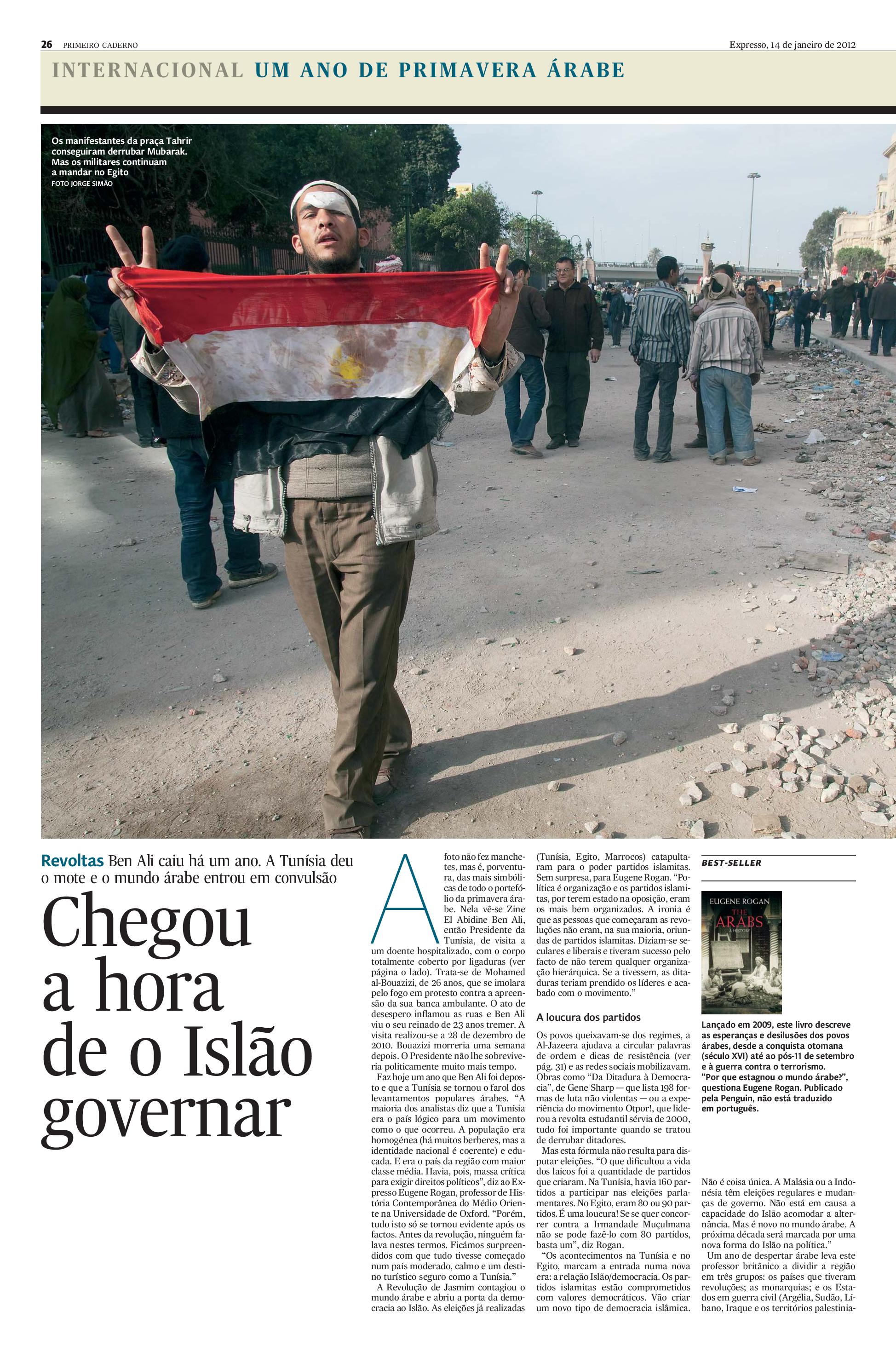 A Revolução de Jasmim contagiou o mundo árabe e abriu a porta da democracia ao Islão. As eleições já realizadas (Tunísia, Egito, Marrocos) catapultaram para o poder partidos islamitas. Sem surpresa, para Eugene Rogan. “Política é organização e os partidos islamitas, por terem estado na oposição, eram os mais bem organizados. A ironia é que as pessoas que começaram as revoluções não eram, na sua maioria, oriundas de partidos islamitas. Diziam-se seculares e liberais e tiveram sucesso pelo facto de não terem qualquer organização hierárquica. Se a tivessem, as ditaduras teriam prendido os líderes e acabado com o movimento.”