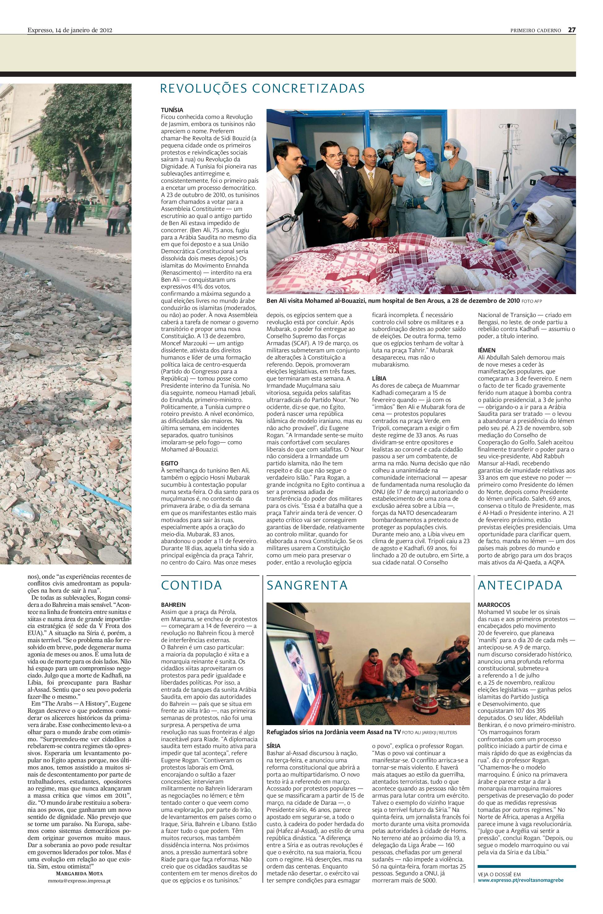 Ficou conhecida como a Revolução de Jasmim, embora os tunisinos não apreciem o nome. Preferem chamar-lhe Revolta de Sidi Bouzid (a pequena cidade onde os primeiros protestos e reivindicações sociais saíram à rua) ou Revolução da Dignidade. A Tunísia foi pioneira nas sublevações antirregime e, consistentemente, foi o primeiro país a encetar um processo democrático. A 23 de outubro de 2010, os tunisinos foram chamados a votar para a Assembleia Constituinte — um escrutínio ao qual o antigo partido de Ben Ali estava impedido de concorrer. (Ben Ali, 75 anos, fugiu para a Arábia Saudita no mesmo dia em que foi deposto e a sua União Democrática Constitucional seria dissolvida dois meses depois.) Os islamitas do Movimento Ennahda (Renascimento) — interdito na era Ben Ali — conquistaram uns expressivos 41% dos votos, confirmando a máxima segundo a qual eleições livres no mundo árabe conduzirão os islamitas (moderados, ou não) ao poder. À nova Assembleia caberá a tarefa de nomear o governo transitório e propor uma nova Constituição. A 13 de dezembro, Moncef Marzouki — um antigo dissidente, ativista dos direitos humanos e líder de uma formação política laica de centro-esquerda (Partido do Congresso para a República) — tomou posse como Presidente interino da Tunísia. No dia seguinte, nomeou Hamadi Jebali, do Ennahda, primeiro-ministro. Politicamente, a Tunísia cumpre o roteiro previsto. A nível económico, as dificuldades são maiores. Na última semana, em incidentes separados, quatro tunisinos imolaram-se pelo fogo — como Mohamed Bouazizi.