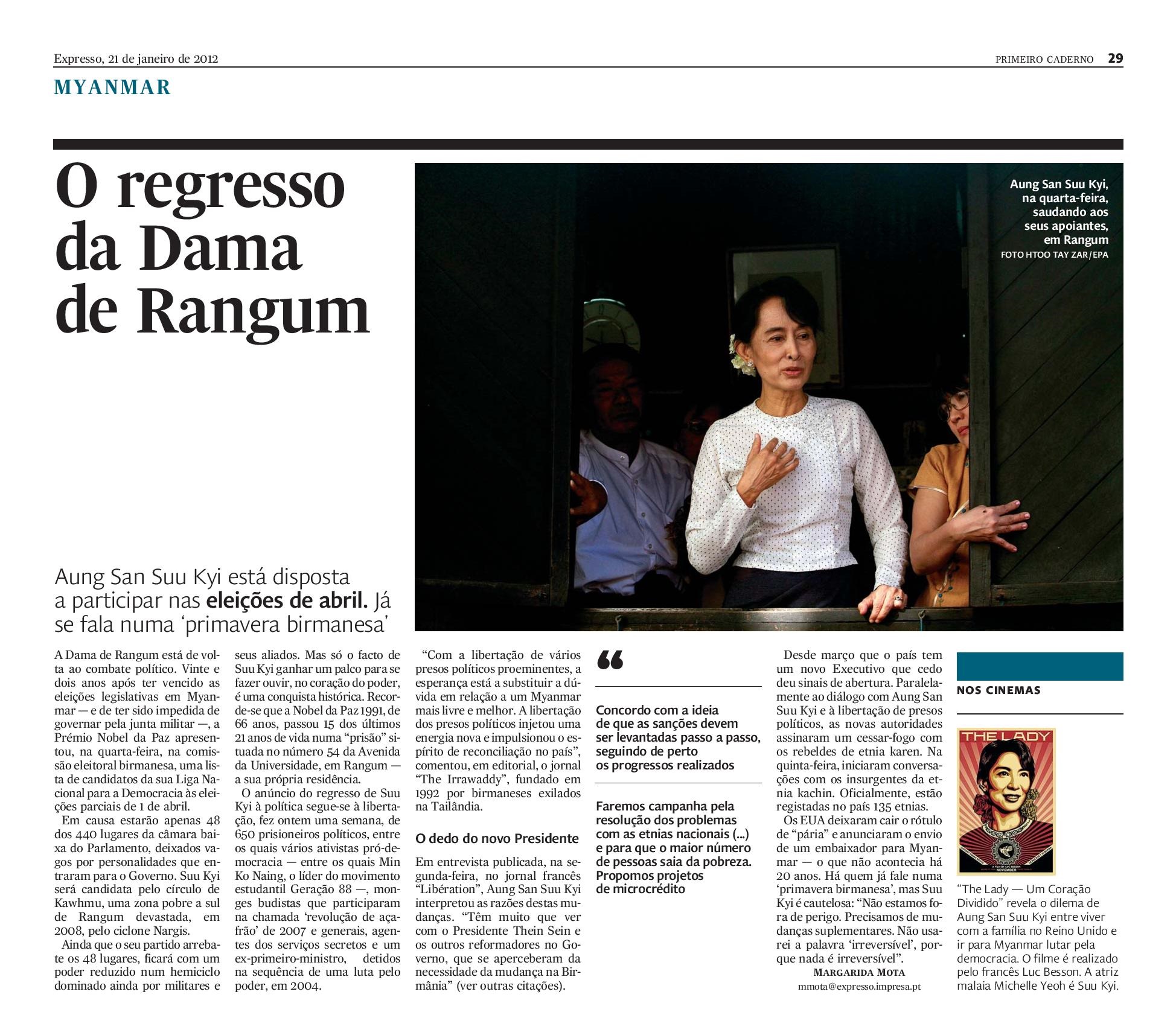 A Dama de Rangum está de volta ao combate político. Vinte e dois anos após ter vencido as eleições legislativas em Myanmar — e de ter sido impedida de governar pela junta militar —, a Prémio Nobel da Paz apresentou, na quarta-feira, na comissão eleitoral birmanesa, uma lista de candidatos da sua Liga Nacional para a Democracia às eleições parciais de 1 de abril.