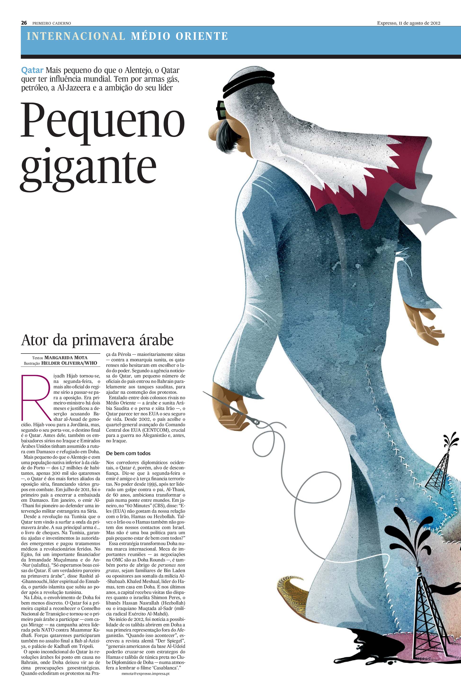 Mais pequeno do que o Alentejo e com uma população nativa inferior à da cidade do Porto — dos 1,7 milhões de habitantes, apenas 300 mil são qatarenses —, o Qatar é dos mais fortes aliados da oposição síria, financiando vários grupos em combate. Em julho de 2011, foi o primeiro país a encerrar a embaixada em Damasco. Em janeiro, o emir Al–Thani foi pioneiro ao defender uma intervenção militar estrangeira na Síria.