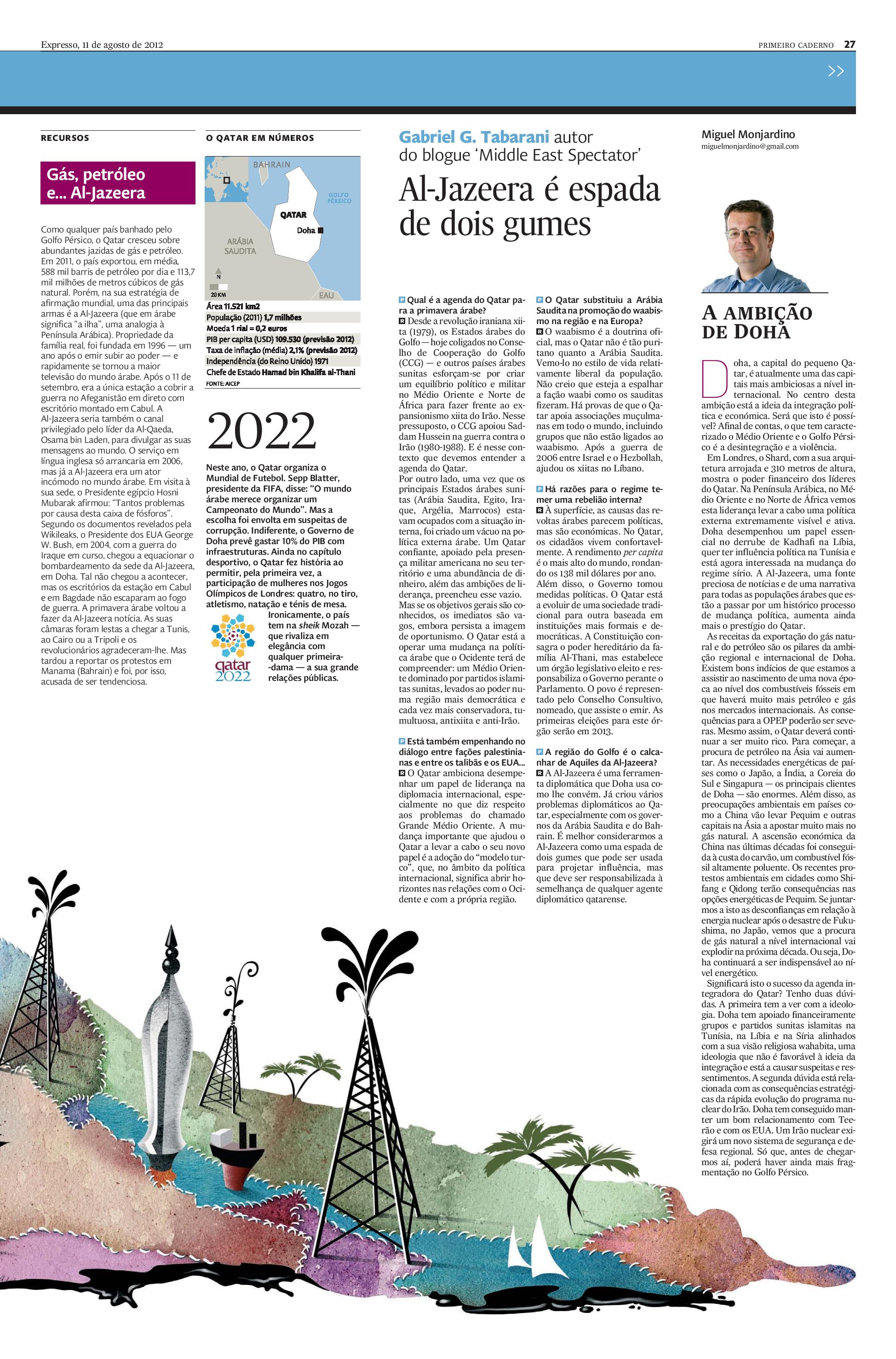 ca). Propriedade da família real, foi fundada em 1996 — um ano após o emir subir ao poder — e rapidamente se tornou a maior televisão do mundo árabe. Após o 11 de Setembro, era a única estação a cobrir a guerra no Afeganistão em direto com escritório montado em Cabul. A Al-Jazira seria também o canal privilegiado pelo líder da Al-Qaeda, Osama bin Laden, para divulgar as suas mensagens ao mundo. O serviço em língua inglesa só arrancaria em 2006, mas já a Al-Jazira era um ator incómodo no mundo árabe. Em visita à sua sede, o Presidente egípcio Hosni Mubarak afirmou: “Tantos problemas por causa desta caixa de fósforos”. Segundo os documentos revelados pela Wikileaks, o Presidente dos EUA George W. Bush, em 2004, com a guerra do Iraque em curso, chegou a equacionar o bombardeamento da sede da Al-Jazira, em Doha. Tal não chegou a acontecer, mas os escritórios da estação em Cabul e em Bagdade não escaparam ao fogo de guerra. A Primavera Árabe voltou a fazer da Al-Jazira notícia. As suas câmaras foram lestas a chegar a Tunis, ao Cairo ou a Tripoli e os revolucionários agradeceram-lhe. Mas tardou a reportar os protestos em Manama (Bahrain) e foi, por isso, acusada de ser tendenciosa.