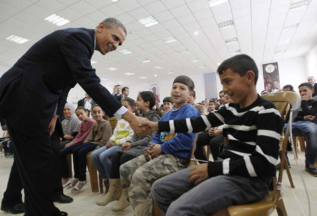 A bordo do helicóptero presidencial Marine One, Obama segue para Jerusalém. Pelas 16h (14h em Lisboa), é recebido por Shimon Peres na Beit Hanassi, a residência presidencial, e por 60 crianças, com bandeiras dos EUA e de Israel. Antes das reuniões de trabalho, Obama plantará uma árvore no jardim da residência. Em Jerusalém (e posteriormente em Ramallah), Obama desloca-se num Chevrolet blindado, conhecido como “A Besta”.