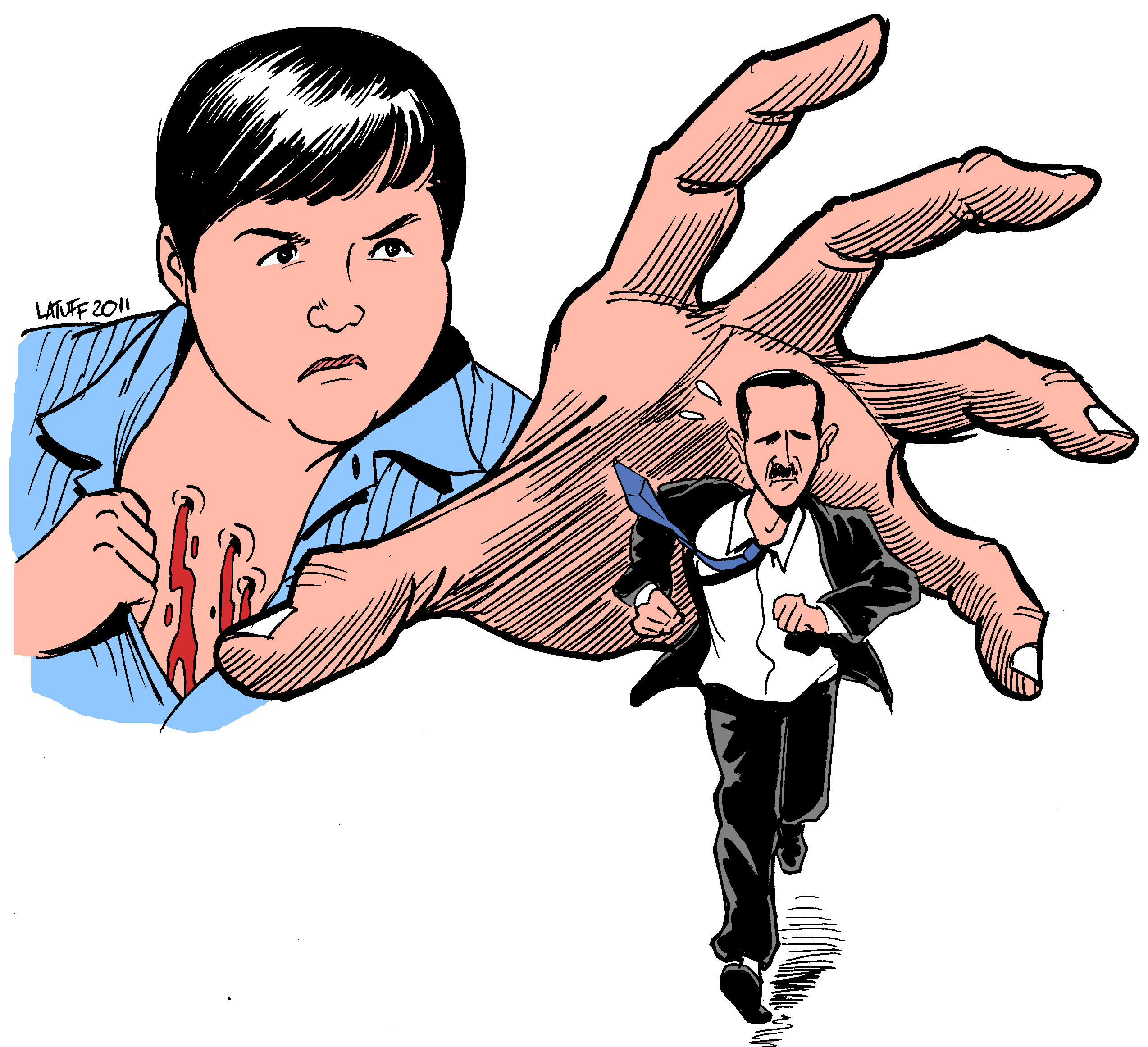 A gozar o fim de semana, a família de Hamza Ali Al-Khateeb, de 13 anos (na ilustração a perseguir Bashar al-Assad), destinou aquela sexta-feira, 29 de abril de 2011, para participar num protesto em Jizah, na província de Daraa. Havia semanas que os ânimos estavam exaltados, após 15 crianças terem sido presas por escreverem nas paredes da escola o slogan que, na televisão, ouviam gritar em vários países árabes: “O povo quer a queda do regime.” Em Jizah, Hamza sumiu-se no caos gerado pela repressão da polícia. A 25 de maio, o cadáver foi devolvido à família, com marcas de queimadura, ferimentos de bala e os órgãos genitais decepados. As imagens do corpo e os indícios de tortura levaram muitos sírios a suspeitar dos serviços secretos. Os protestos continuaram e, além do “Dia da Ira” (às sextas-feiras), os sírios passaram a assinalar, aos sábados, o Dia de Hamza. ILUSTRAÇÃO DE CARLOS LATUFF / WIKIMEDIA COMMONS