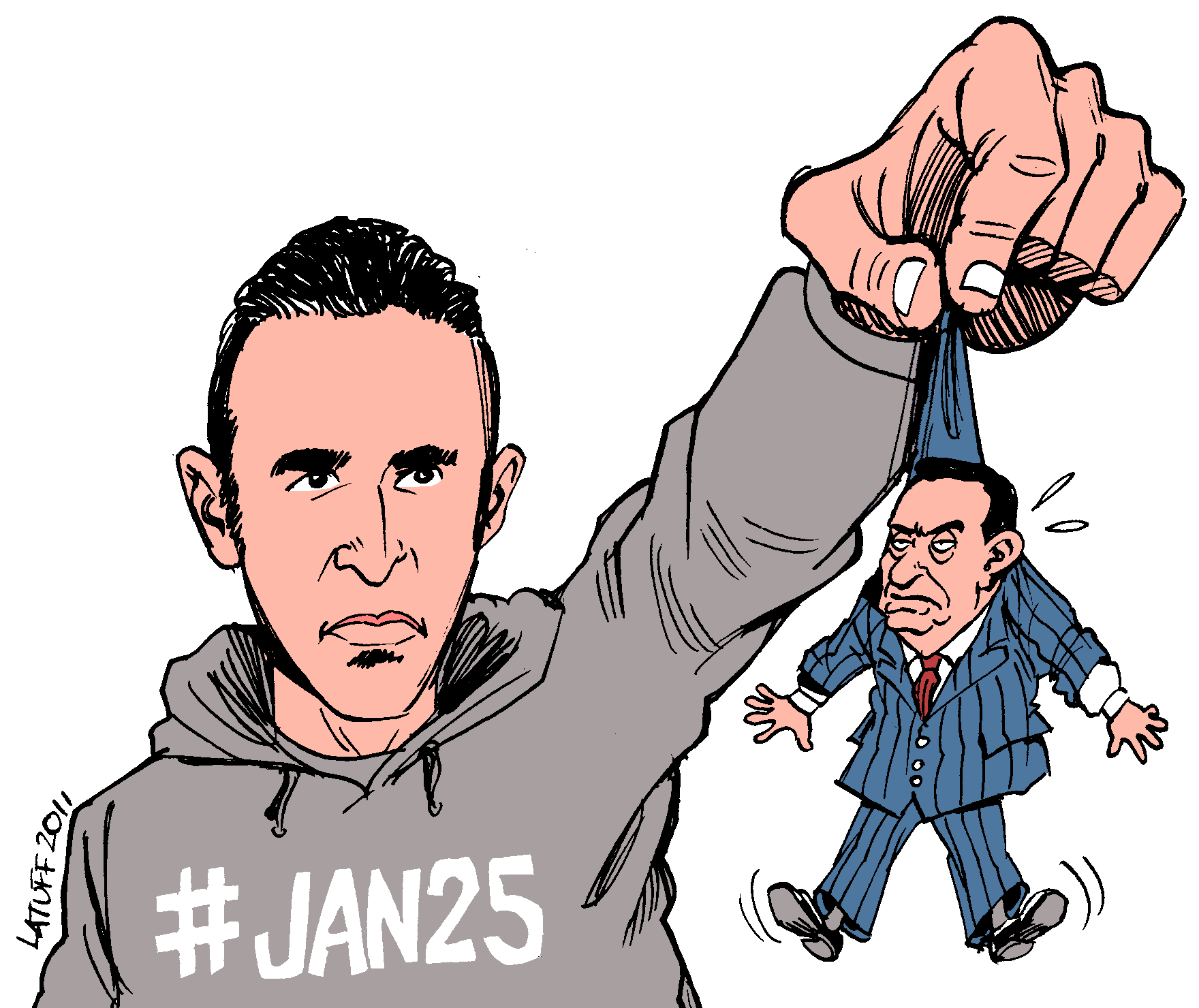 Khaled Said (o jovem retratado na ilustração) adorava computadores e passava longas horas num cibercafé da cidade de Alexandria, onde vivia com a mãe. A 6 de junho de 2010, dois agentes da polícia de Sidi Gaber irromperam pelo café e arrastaram-no para a rua, onde o espancaram até à morte. Khaled, de 28 anos, provocara a fúria da polícia ao publicar, no YouTube, um vídeo que mostrava vários polícias a distribuírem entre si o produto de uma apreensão de haxixe. A foto do seu rosto desfigurado — tirada na morgue, por um irmão, com o seu telemóvel — tornou-se viral na internet. A 19 de julho de 2010, foi criada, no Facebook, a página “Todos Somos Khaled Said”, para denunciar casos de tortura e “a brutalidade da polícia egípcia” em geral. Neste mural foi convocada a primeira grande manifestação antirregime, que saiu às ruas a 25 de janeiro de 2011. ILUSTRAÇÃO DE CARLOS LATUFF / WIKIMEDIA COMMONS