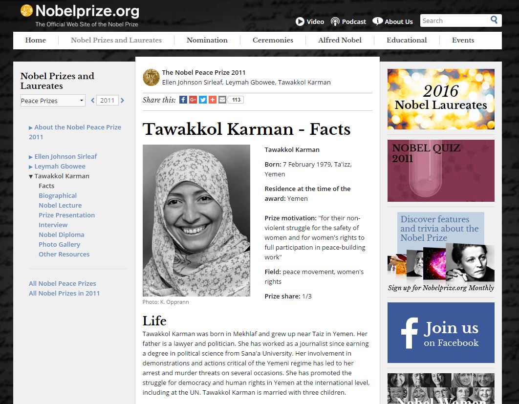 Os iemenitas chamam-lhe “a mãe da revolução”. Tawakkol Karman deu nas vistas em 2005 quando, aos 26 anos, fundou a Jornalistas Femininas Sem Correntes (WJWC, em inglês). No ano seguinte, a organização iniciou um serviço de mensagens instantâneas para telemóveis, com notícias sobre direitos humanos. Tornou-se tão popular que o Governo o encerrou. A WJWC não baixou os braços e começou a publicar relatórios anuais sobre a liberdade de imprensa no Iémen. Aos poucos, as denúncias começaram a extrapolar o âmbito dos media e a visar também casos de corrupção. A 15 de janeiro de 2011, Tawakkol organizou uma jornada de solidariedade para com a revolução tunisina. Manifestações anteriores já a tinham levado, várias vezes, à prisão e a viver sob ameaças de morte. Em 2011, ganhou o Nobel da Paz.