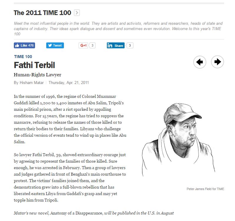 Fathi Terbil é um advogado e ativista que, em 1996, após o massacre de cerca de 1200 amotinados na prisão de Abu Salim, aceitou representar famílias das vítimas. Tornou-se persona non grata para o regime que, a 15 de fevereiro de 2011, o mandou prender pela sétima vez. A notícia correu depressa e, no mesmo dia, centenas de pessoas reuniram-se em frente à sede da polícia de Bengasi para exigir a sua libertação. Fathi voltou a ver a luz do sol no dia seguinte, mas os protestos não mais pararam na segunda cidade líbia, que se tornaria o berço da revolução. Nesse ano, Fathi recebeu o Prémio Ludovic-Trarieux, atribuído a um advogado que se tenha destacado na defesa dos Direitos Humanos — em 1985, foi dado a Mandela. Hoje, com 43 anos, Fathi é ministro da Juventude e Desporto do Governo Interino. [Fathi Terbil foi escolhido pela revista “Time” (na imagem) como uma das 100 pessoas mais influentes do mundo em 2011.]