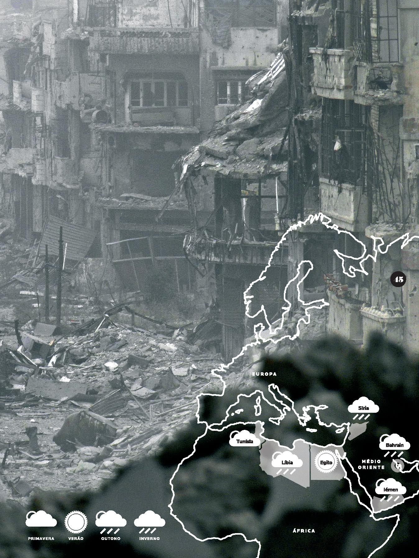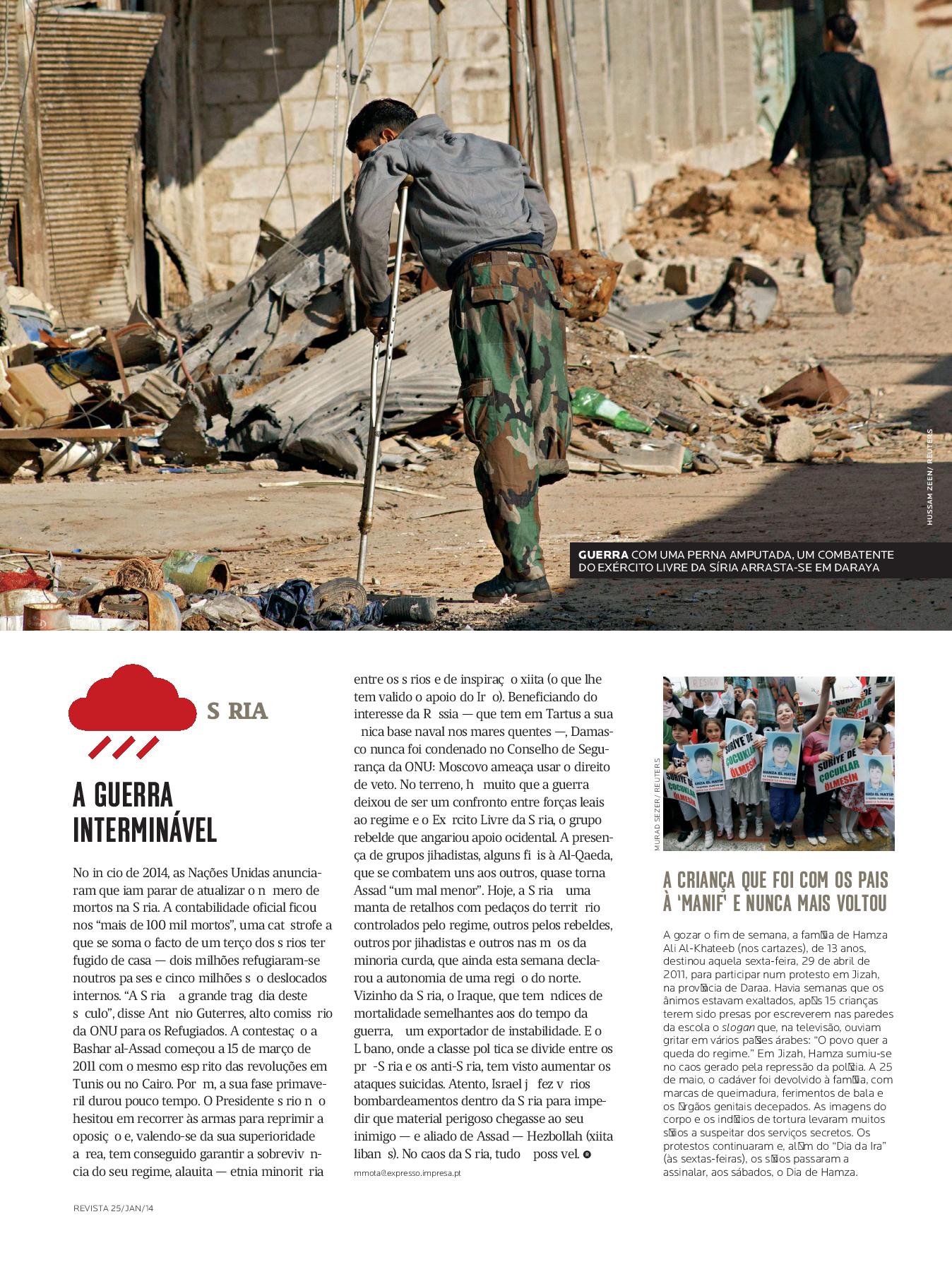 No início de 2014, as Nações Unidas anunciaram que iam parar de atualizar o número de mortos na Síria. A contabilidade oficial ficou nos “mais de 100 mil mortos”, uma catástrofe a que se soma o facto de um terço dos sírios ter fugido de casa — dois milhões refugiaram-se noutros países e cinco milhões são deslocados internos. “A Síria é a grande tragédia deste século”, disse António Guterres, alto comissário da ONU para os Refugiados. A contestação a Bashar al-Assad começou a 15 de março de 2011 com o mesmo espírito das revoluções em Tunis ou no Cairo. Porém, a sua fase primaveril durou pouco tempo. O Presidente sírio não hesitou em recorrer às armas para reprimir a oposição e, valendo-se da sua superioridade aérea, tem conseguido garantir a sobrevivência do seu regime, alauita — etnia minoritária entre os sírios e de inspiração xiita (o que lhe tem valido o apoio do Irão). Beneficiando do interesse da Rússia — que tem em Tartus a sua única base naval nos mares quentes —, Damasco nunca foi condenado no Conselho de Segurança da ONU: Moscovo ameaça usar o direito de veto. No terreno, há muito que a guerra deixou de ser um confronto entre forças leais ao regime e o Exército Livre da Síria, o grupo rebelde que angariou apoio ocidental. A presença de grupos jihadistas, alguns fiéis à Al-Qaida, que se combatem uns aos outros, quase torna Assad “um mal menor”. Hoje, a Síria é uma manta de retalhos com pedaços do território controlados pelo regime, outros pelos rebeldes, outros por jihadistas e outros nas mãos da minoria curda, que ainda esta semana declarou a autonomia de uma região do norte. Vizinho da Síria, o Iraque, que tem índices de mortalidade semelhantes aos do tempo da guerra, é um exportador de instabilidade. E o Líbano, onde a classe política se divide entre os pró-Síria e os anti-Síria, tem visto aumentar os ataques suicidas. Atento, Israel já fez vários bombardeamentos dentro da Síria para impedir que material perigoso chegasse ao seu inimigo — e aliado de Assad — Hezbollah (xiita libanês). No caos da Síria, tudo é possível.