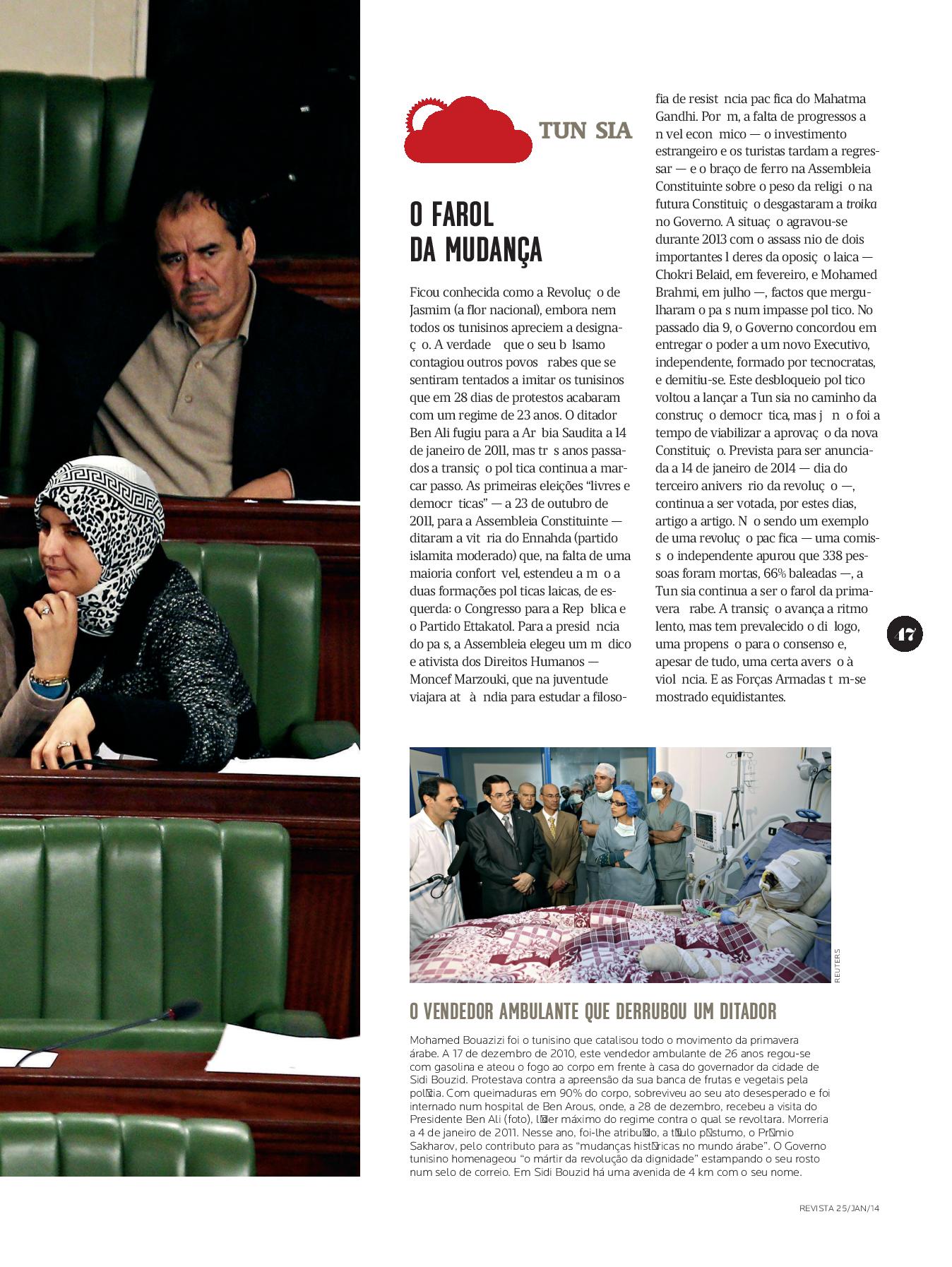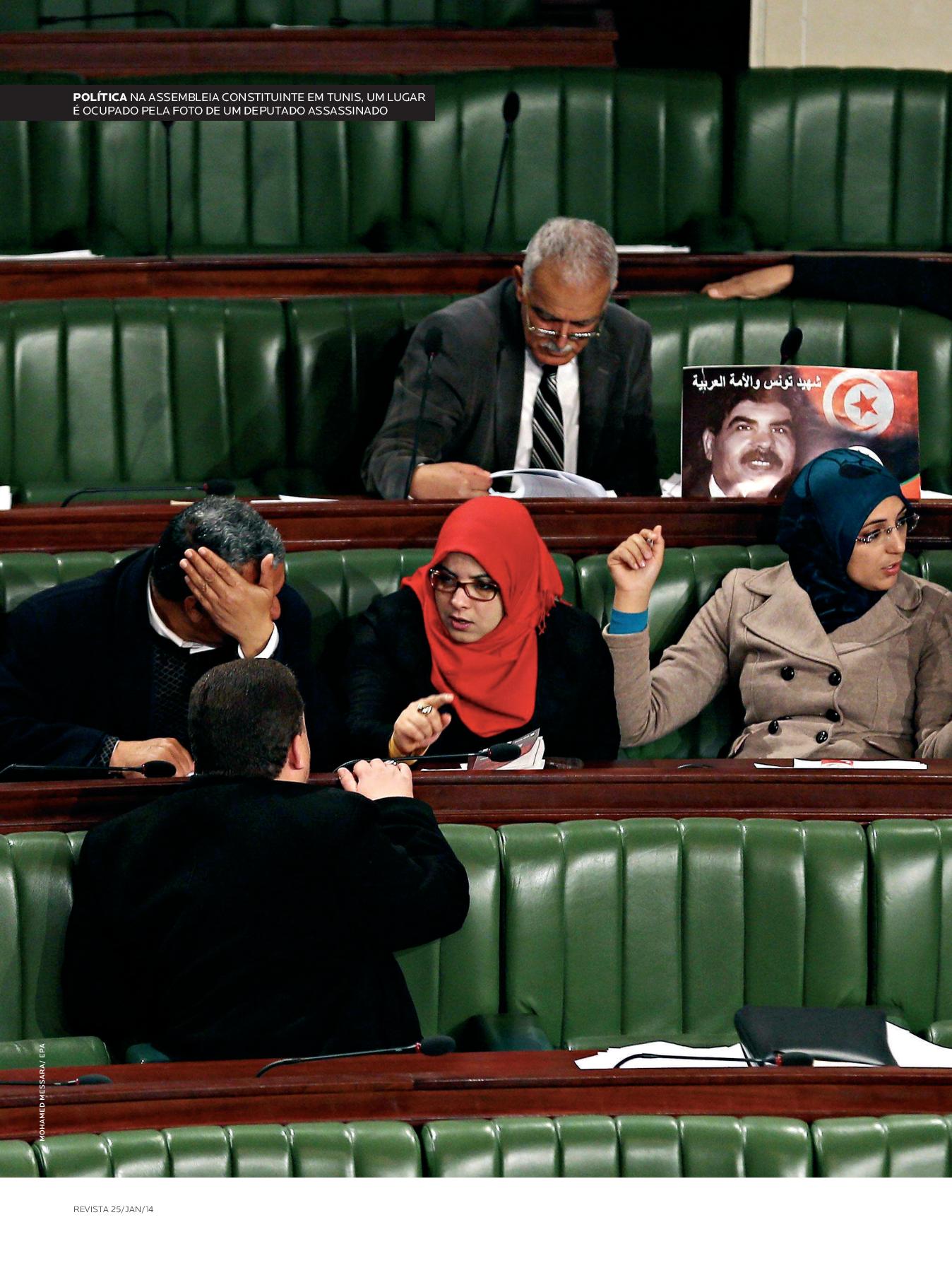 Ficou conhecida como a Revolução de Jasmim (a flor nacional), embora nem todos os tunisinos apreciem a designação. A verdade é que o seu bálsamo contagiou outros povos árabes que se sentiram tentados a imitar os tunisinos que em 28 dias de protestos acabaram com um regime de 23 anos. O ditador Ben Ali fugiu para a Arábia Saudita a 14 de janeiro de 2011, mas três anos passados a transição política continua a marcar passo. As primeiras eleições “livres e democráticas” — a 23 de outubro de 2011, para a Assembleia Constituinte — ditaram a vitória do Ennahda (partido islamita moderado) que, na falta de uma maioria confortável, estendeu a mão a duas formações políticas laicas, de esquerda: o Congresso para a República e o Partido Ettakatol. Para a presidência do país, a Assembleia elegeu um médico e ativista dos Direitos Humanos — Moncef Marzouki, que na juventude viajara até à Índia para estudar a filosofia de resistência pacífica do Mahatma Gandhi. Porém, a falta de progressos a nível económico — o investimento estrangeiro e os turistas tardam a regressar — e o braço de ferro na Assembleia Constituinte sobre o peso da religião na futura Constituição desgastaram a troika no Governo. A situação agravou-se durante 2013 com o assassínio de dois importantes líderes da oposição laica — Chokri Belaid, em fevereiro, e Mohamed Brahmi, em julho —, factos que mergulharam o país num impasse político. No passado dia 9, o Governo concordou em entregar o poder a um novo Executivo, independente, formado por tecnocratas, e demitiu-se. Este desbloqueio político voltou a lançar a Tunísia no caminho da construção democrática, mas já não foi a tempo de viabilizar a aprovação da nova Constituição. Prevista para ser anunciada a 14 de janeiro de 2014 — dia do terceiro aniversário da revolução —, continua a ser votada, por estes dias, artigo a artigo. Não sendo um exemplo de uma revolução pacífica — uma comissão independente apurou que 338 pessoas foram mortas, 66% baleadas —, a Tunísia continua a ser o farol da Primavera Árabe. A transição avança a ritmo lento, mas tem prevalecido o diálogo, uma propensão para o consenso e, apesar de tudo, uma certa aversão à violência. E as Forças Armadas têm-se mostrado equidistantes.