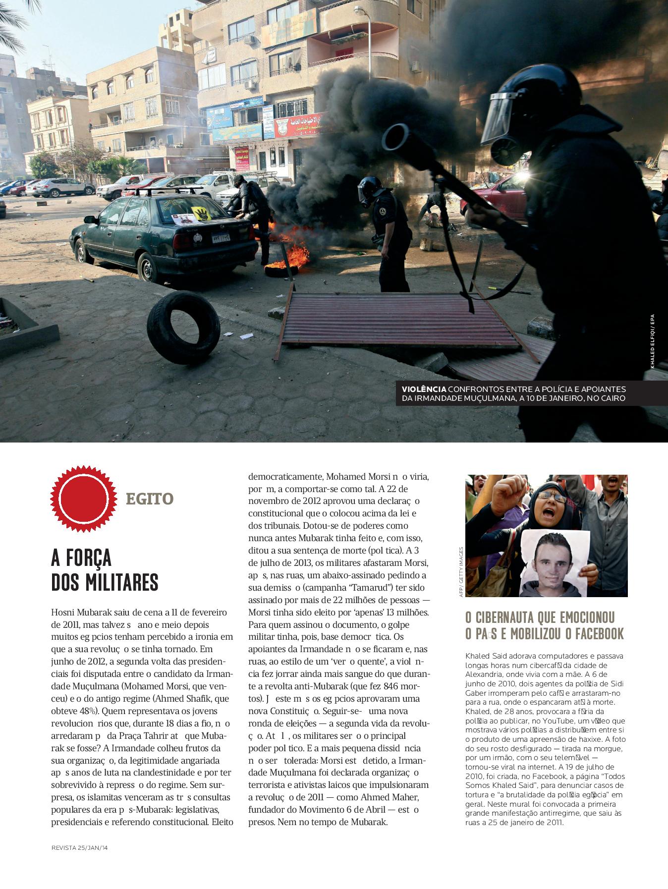 Hosni Mubarak saiu de cena a 11 de fevereiro de 2011, mas talvez só ano e meio depois muitos egípcios tenham percebido a ironia em que a sua revolução se tinha tornado. Em junho de 2012, a segunda volta das presidenciais foi disputada entre o candidato da Irmandade Muçulmana (Mohamed Morsi, que venceu) e o do antigo regime (Ahmed Shafik, que obteve 48%). Quem representava os jovens revolucionários que, durante 18 dias a fio, não arredaram pé da Praça Tahrir até que Mubarak se fosse? A Irmandade colheu frutos da sua organização, da legitimidade angariada após anos de luta na clandestinidade e por ter sobrevivido à repressão do regime. Sem surpresa, os islamitas venceram as três consultas populares da era pós-Mubarak: legislativas, presidenciais e referendo constitucional. Eleito democraticamente, Mohamed Morsi não viria, porém, a comportar-se como tal. A 22 de novembro de 2012 aprovou uma declaração constitucional que o colocou acima da lei e dos tribunais. Dotou-se de poderes como nunca antes Mubarak tinha feito e, com isso, ditou a sua sentença de morte (política). A 3 de julho de 2013, os militares afastaram Morsi, após, nas ruas, um abaixo-assinado pedindo a sua demissão (campanha “Tamarud”) ter sido assinado por mais de 22 milhões de pessoas — Morsi tinha sido eleito por ‘apenas’ 13 milhões. Para quem assinou o documento, o golpe militar tinha, pois, base democrática. Os apoiantes da Irmandade não se ficaram e, nas ruas, ao estilo de um ‘verão quente’, a violência fez jorrar ainda mais sangue do que durante a revolta anti-Mubarak (que fez 846 mortos). Já este mês os egípcios aprovaram uma nova Constituição. Seguir-se-á uma nova ronda de eleições — a segunda vida da revolução. Até lá, os militares serão o principal poder político. E a mais pequena dissidência não será tolerada: Morsi está detido, a Irmandade Muçulmana foi declarada organização terrorista e ativistas laicos que impulsionaram a revolução de 2011 — como Ahmed Maher, fundador do Movimento 6 de Abril — estão presos. Nem no tempo de Mubarak.