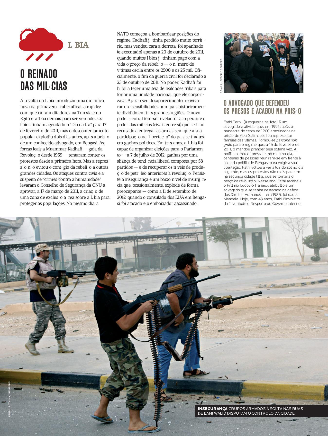 A revolta na Líbia introduziu uma dinâmica nova na Primavera Árabe: afinal, a rapidez com que caíram ditadores na Tunísia e no Egito era ‘boa demais para ser verdade’. Os líbios tinham agendado o “Dia da Ira” para 17 de fevereiro de 2011, mas o descontentamento popular explodiu dois dias antes, após a prisão de um conhecido advogado, em Bengasi. As forças leais a Muammar Kadhafi — guia da Revolução desde 1969 — tentaram conter os protestos desde a primeira hora. Mas a repressão não evitou o contágio da rebelião a outras grandes cidades. Os ataques contra civis e a suspeita de “crimes contra a humanidade” levaram o Conselho de Segurança da ONU a aprovar, a 17 de março de 2011, a criação de uma zona de exclusão aérea sobre a Líbia para proteger as populações. No mesmo dia, a NATO começou a bombardear posições do regime. Kadhafi já tinha perdido muito território, mas vendeu cara a derrota: foi apanhado (e executado) apenas a 20 de outubro de 2011, quando muitos líbios já tinham pago com a vida o preço da rebelião — o número de vítimas oscila entre os 2500 e os 25 mil. Oficialmente, o fim da guerra civil foi declarado a 23 de outubro de 2011. No poder, Kadhafi foi hábil a tecer uma teia de lealdades tribais para forjar uma unidade nacional, que ele corporizava. Após o seu desaparecimento, reavivaram-se sensibilidades num país historicamente dividido em três grandes regiões. O novo poder central tem-se revelado fraco perante o poder das milícias (rivais entre si) que se têm recusado a entregar as armas sem que a sua participação na “libertação” do país se traduza em ganhos políticos. Em três anos, a Líbia foi capaz de organizar eleições para o Parlamento — a 7 de julho de 2012, ganhas por uma aliança de tendência liberal composta por 58 partidos — e de recuperar os níveis de produção de petróleo anteriores à revolução. Persiste a insegurança e um baixo nível de insurgência que, ocasionalmente, explode de forma preocupante — como a 11 de setembro de 2012, quando o consulado dos EUA em Bengasi foi atacado e o embaixador assassinado.