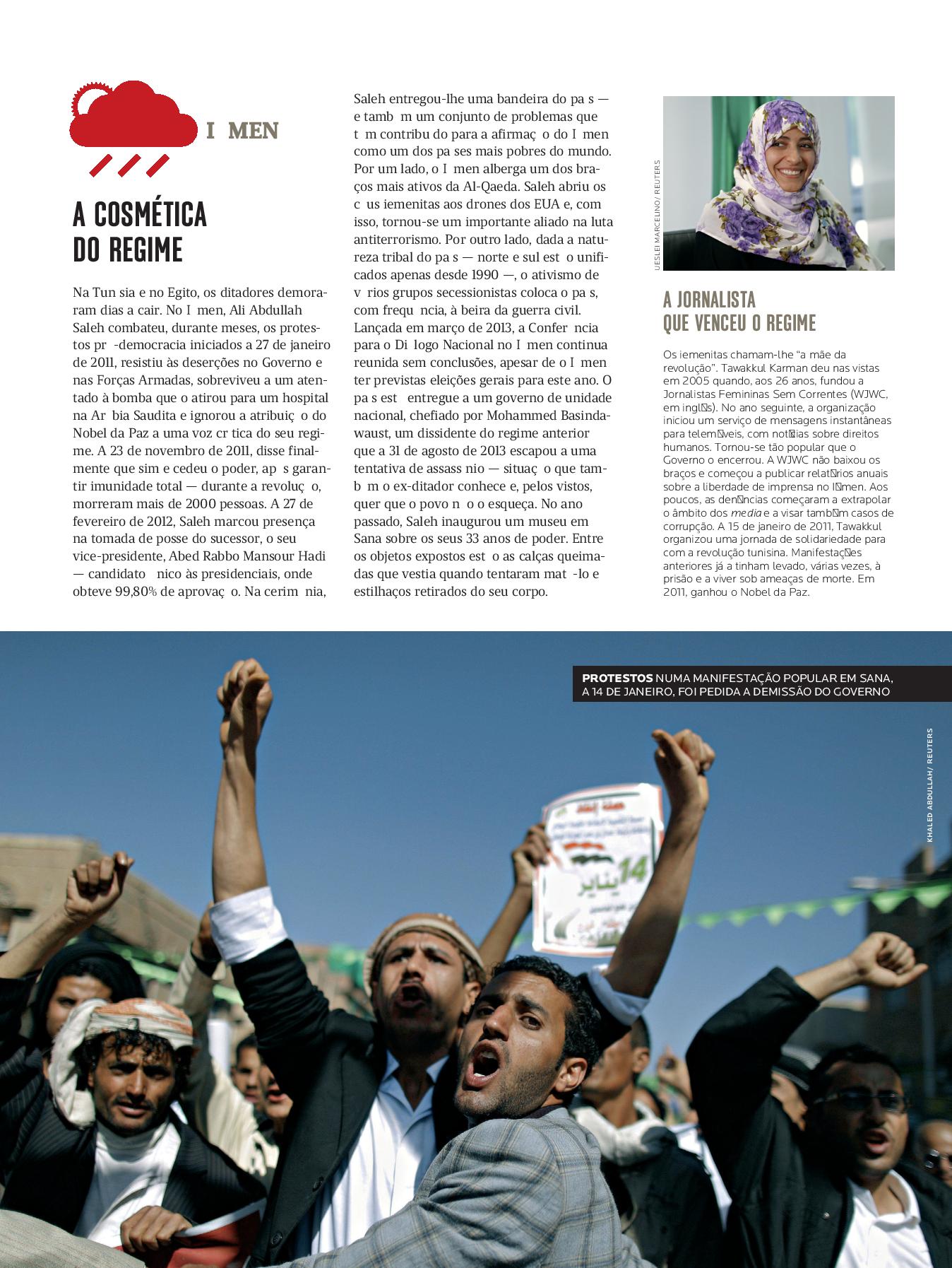 Na Tunísia e no Egito, os ditadores demoraram dias a cair. No Iémen, Ali Abdullah Saleh combateu, durante meses, os protestos pró-democracia iniciados a 27 de janeiro de 2011, resistiu às deserções no Governo e nas Forças Armadas, sobreviveu a um atentado à bomba que o atirou para um hospital na Arábia Saudita e ignorou a atribuição do Nobel da Paz a uma voz crítica do seu regime. A 23 de novembro de 2011, disse finalmente que sim e cedeu o poder, após garantir imunidade total — durante a revolução, morreram mais de 2000 pessoas. A 27 de fevereiro de 2012, Saleh marcou presença na tomada de posse do sucessor, o seu vice-presidente, Abd Rabbuh Mansur al-Hadi — candidato único às presidenciais, onde obteve 99,80% de aprovação. Na cerimónia, Saleh entregou-lhe uma bandeira do país — e também um conjunto de problemas que têm contribuído para a afirmação do Iémen como um dos países mais pobres do mundo. Por um lado, o Iémen alberga um dos braços mais ativos da Al-Qaeda. Saleh abriu os céus iemenitas aos drones dos EUA e, com isso, tornou-se um importante aliado na luta antiterrorismo. Por outro lado, dada a natureza tribal do país — norte e sul estão unificados apenas desde 1990 —, o ativismo de vários grupos secessionistas coloca o país, com frequência, à beira da guerra civil. Lançada em março de 2013, a Conferência para o Diálogo Nacional no Iémen continua reunida sem conclusões, apesar de o Iémen ter previstas eleições gerais para este ano. O país está entregue a um governo de unidade nacional, chefiado por Mohammed Basindawaust, um dissidente do regime anterior que a 31 de agosto de 2013 escapou a uma tentativa de assassínio — situação que também o ex-ditador conhece e, pelos vistos, quer que o povo não o esqueça. No ano passado, Saleh inaugurou um museu em Sana sobre os seus 33 anos de poder. Entre os objetos expostos estão as calças queimadas que vestia quando tentaram matá-lo e estilhaços retirados do seu corpo.