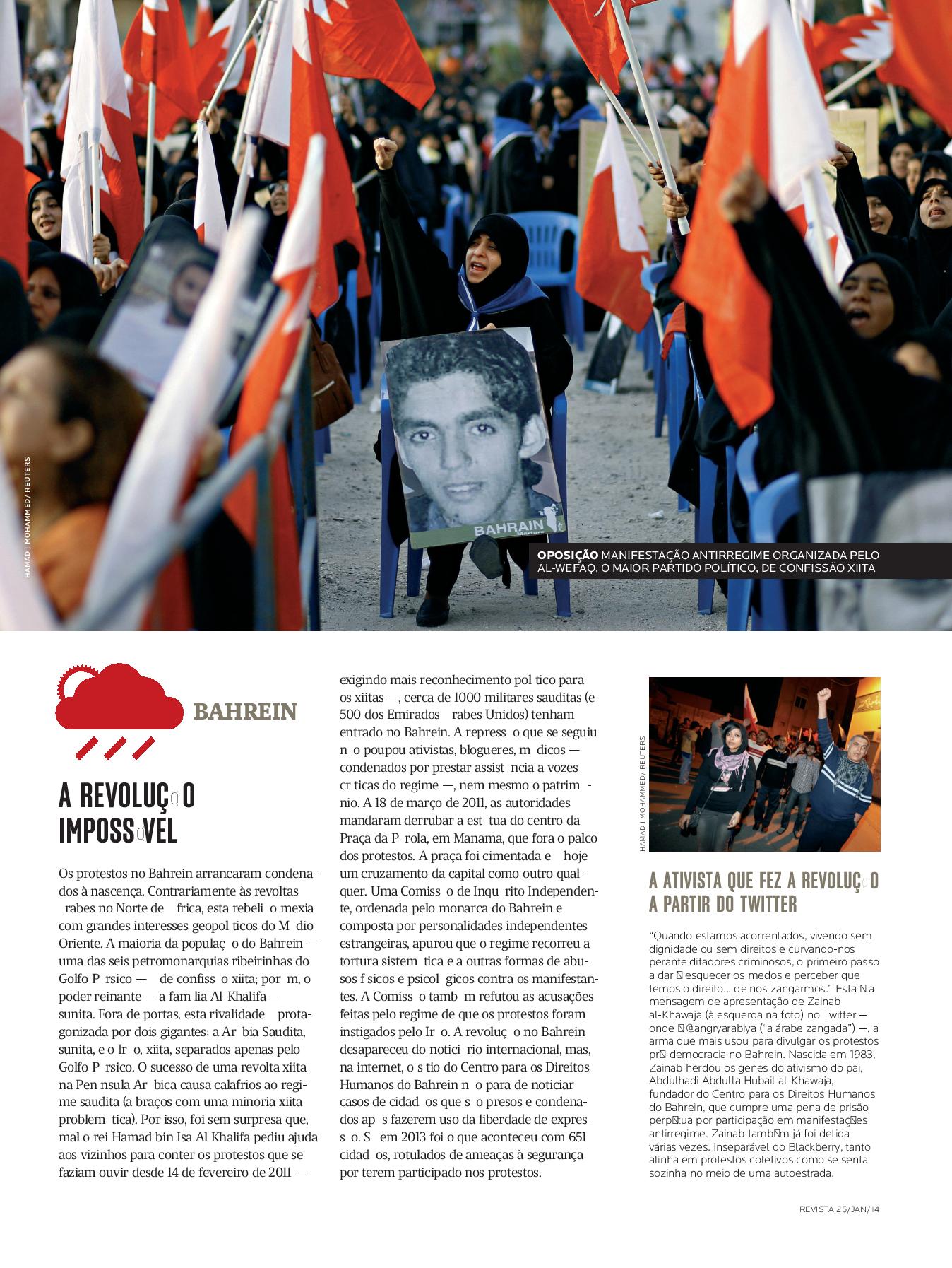 Os protestos no Bahrain arrancaram condenados à nascença. Contrariamente às revoltas árabes no Norte de África, esta rebelião mexia com grandes interesses geopolíticos do Médio Oriente. A maioria da população do Bahrain — uma das seis petromonarquias ribeirinhas do Golfo Pérsico — é de confissão xiita; porém, o poder reinante — a família Al-Khalifa — é sunita. Fora de portas, esta rivalidade é protagonizada por dois gigantes: a Arábia Saudita, sunita, e o Irão, xiita, separados apenas pelo Golfo Pérsico. O sucesso de uma revolta xiita na Península Arábica causa calafrios ao regime saudita (a braços com uma minoria xiita problemática). Por isso, foi sem surpresa que, mal o rei Hamad bin Isa Al Khalifa pediu ajuda aos vizinhos para conter os protestos que se faziam ouvir desde 14 de fevereiro de 2011 — exigindo mais reconhecimento político para os xiitas —, cerca de 1000 militares sauditas (e 500 dos Emirados Árabes Unidos) tenham entrado no Bahrain. A repressão que se seguiu não poupou ativistas, blogueres, médicos — condenados por prestar assistência a vozes críticas do regime —, nem mesmo o património. A 18 de março de 2011, as autoridades mandaram derrubar a estátua do centro da Praça da Pérola, em Manama, que fora o palco dos protestos. A praça foi cimentada e é hoje um cruzamento da capital como outro qualquer. Uma Comissão de Inquérito Independente, ordenada pelo monarca do Bahrain e composta por personalidades independentes estrangeiras, apurou que o regime recorreu a tortura sistemática e a outras formas de abusos físicos e psicológicos contra os manifestantes. A Comissão também refutou as acusações feitas pelo regime de que os protestos foram instigados pelo Irão. A revolução no Bahrain desapareceu do noticiário internacional, mas, na internet, o sítio do Centro para os Direitos Humanos do Bahrain não para de noticiar casos de cidadãos que são presos e condenados após fazerem uso da liberdade de expressão. Só em 2013 foi o que aconteceu com 651 cidadãos, rotulados de ameaças à segurança por terem participado nos protestos.