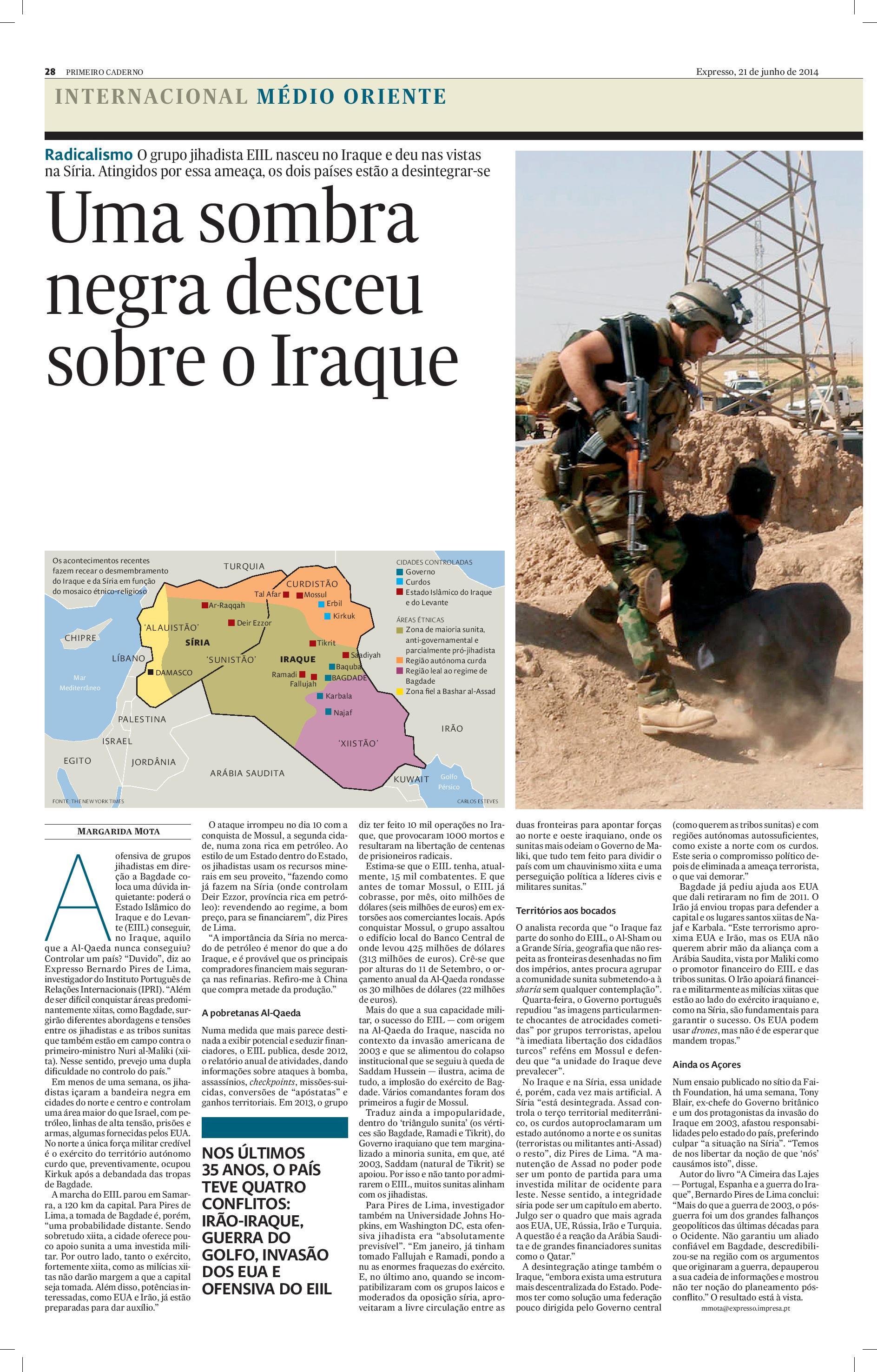 A ofensiva de grupos jihadistas em direção a Bagdade coloca uma dúvida inquietante: poderá o Estado Islâmico do Iraque e do Levante (EIIL) conseguir, no Iraque, aquilo que a Al-Qaeda nunca conseguiu? Controlar um país? “Duvido”, diz ao Expresso Bernardo Pires de Lima, investigador do Instituto Português de Relações Internacionais (IPRI). “Além de ser difícil conquistar áreas predominantemente xiitas, como Bagdade, surgirão diferentes abordagens e tensões entre os jihadistas e as tribos sunitas que também estão em campo contra o primeiro-ministro Nuri al-Maliki (xiita). Nesse sentido, prevejo uma dupla dificuldade no controlo do país.”