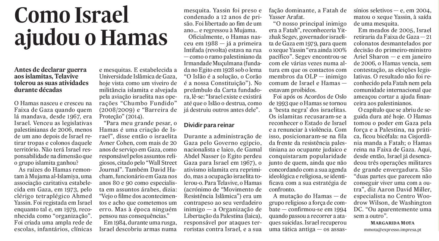 O Hamas nasceu e cresceu na Faixa de Gaza quando quem lá mandava, desde 1967, era Israel. Venceu as legislativas palestinianas de 2006, menos de um ano depois de Israel retirar tropas e colonos daquele território. Não terá Israel responsabilidade na dimensão que o grupo islamita ganhou?