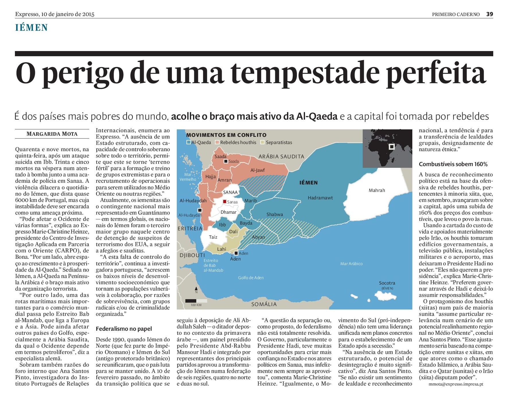 “Pode afetar o Ocidente de várias formas”, explica ao “Expresso” Marie-Christine Heinze, presidente do Centro de Investigação Aplicada em Parceria com o Oriente (CARPO), de Bona. “Por um lado, abre espaço ao crescimento e à prosperidade da Al-Qaida.” Sediada no Iémen, a Al-Qaida na Península Arábica é o braço mais ativo da organização terrorista.