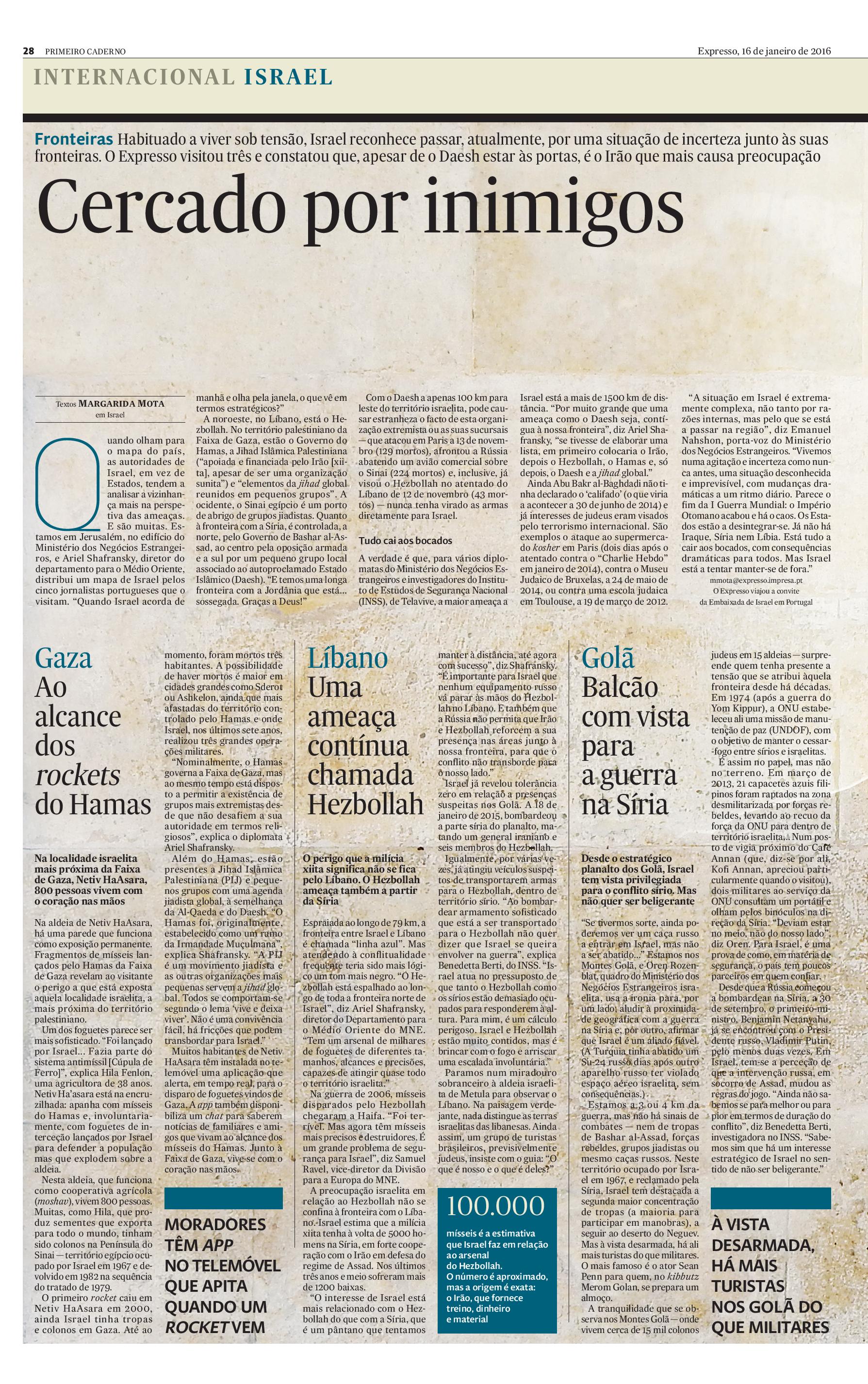 Espraiada ao longo de 79 km, a fronteira entre Israel e Líbano é chamada “linha azul”. Mas atendendo à conflitualidade frequente teria sido mais lógico um tom mais negro. “O Hezbollah está espalhado ao longo de toda a fronteira norte de Israel”, diz Ariel Shafransky, diretor do Departamento para o Médio Oriente do MNE. “Tem um arsenal de milhares de foguetes de diferentes tamanhos, alcances e precisões, capazes de atingir quase todo o território israelita.”