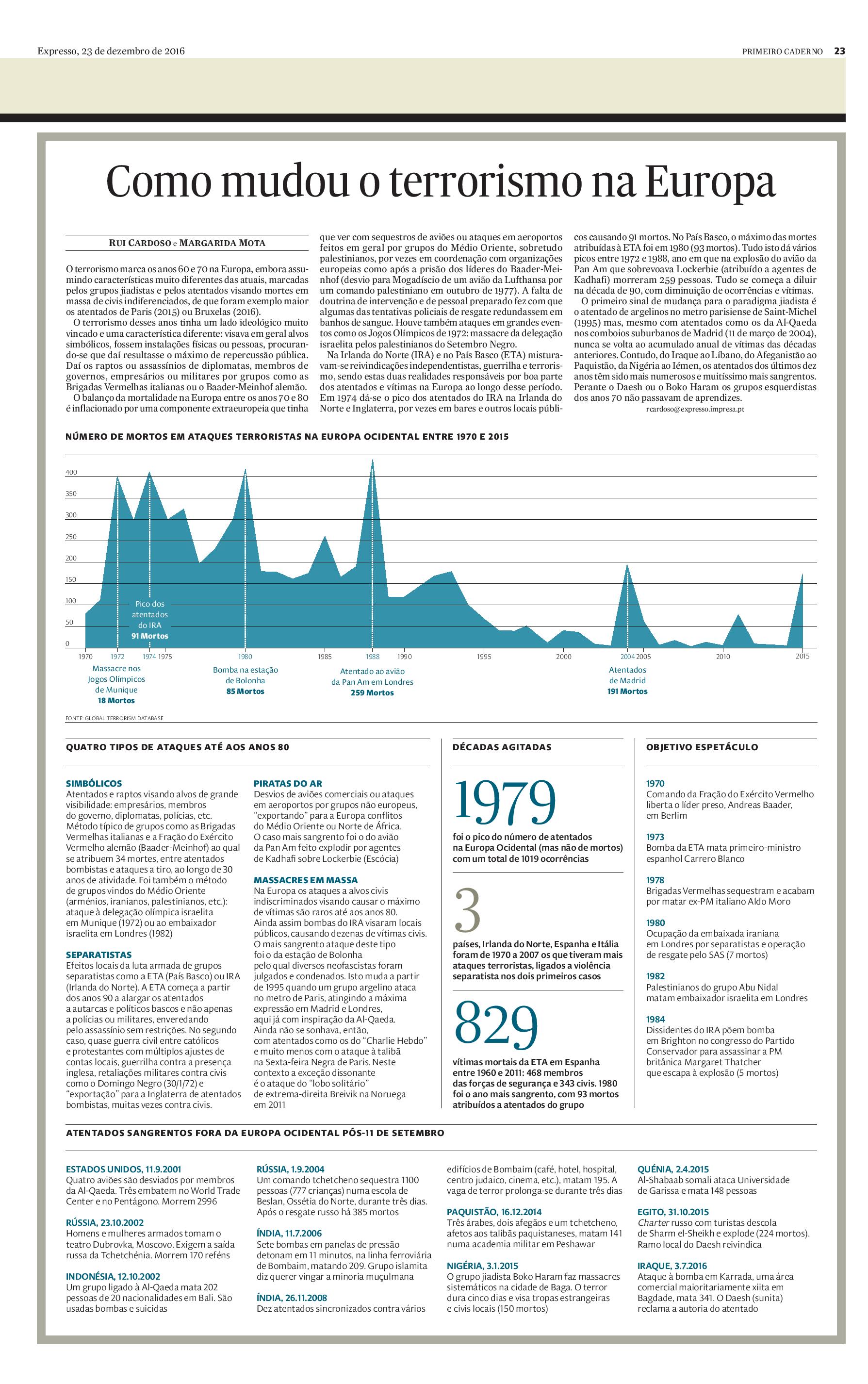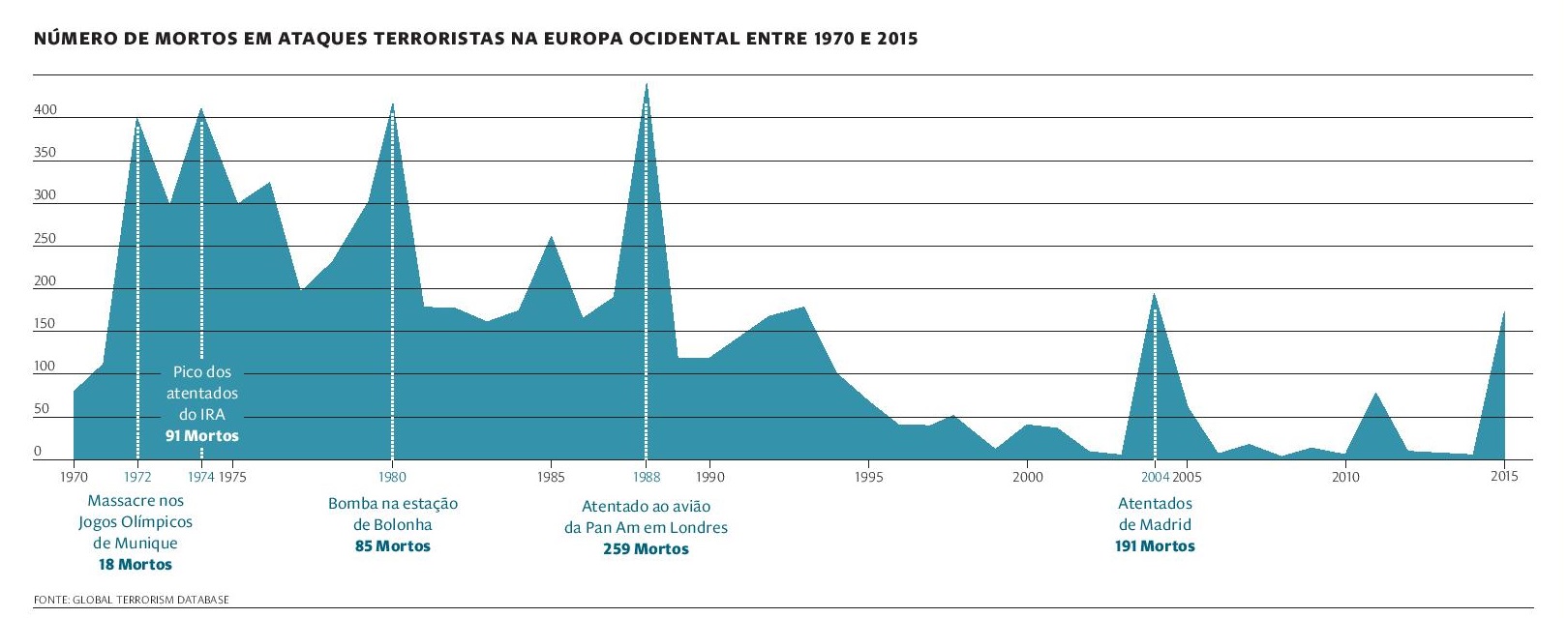 Na Europa os ataques a alvos civis indiscriminados visando causar o máximo de vítimas são raros até aos anos 80. Ainda assim bombas do IRA visaram locais públicos, causando dezenas de vítimas civis. O mais sangrento ataque deste tipo foi o da estação de Bolonha pelo qual diversos neofascistas foram julgados e condenados. Isto muda a partir de 1995 quando um grupo argelino ataca no metro de Paris, atingindo a máxima expressão em Madrid e Londres, aqui já com inspiração da Al-Qaeda. Ainda não se sonhava, então, com atentados como os do “Charlie Hebdo” e muito menos com o ataque à talibã na Sexta-feira Negra de Paris. Neste contexto a exceção dissonante é o ataque do “lobo solitário” de extrema-direita Breivik na Noruega em 2011