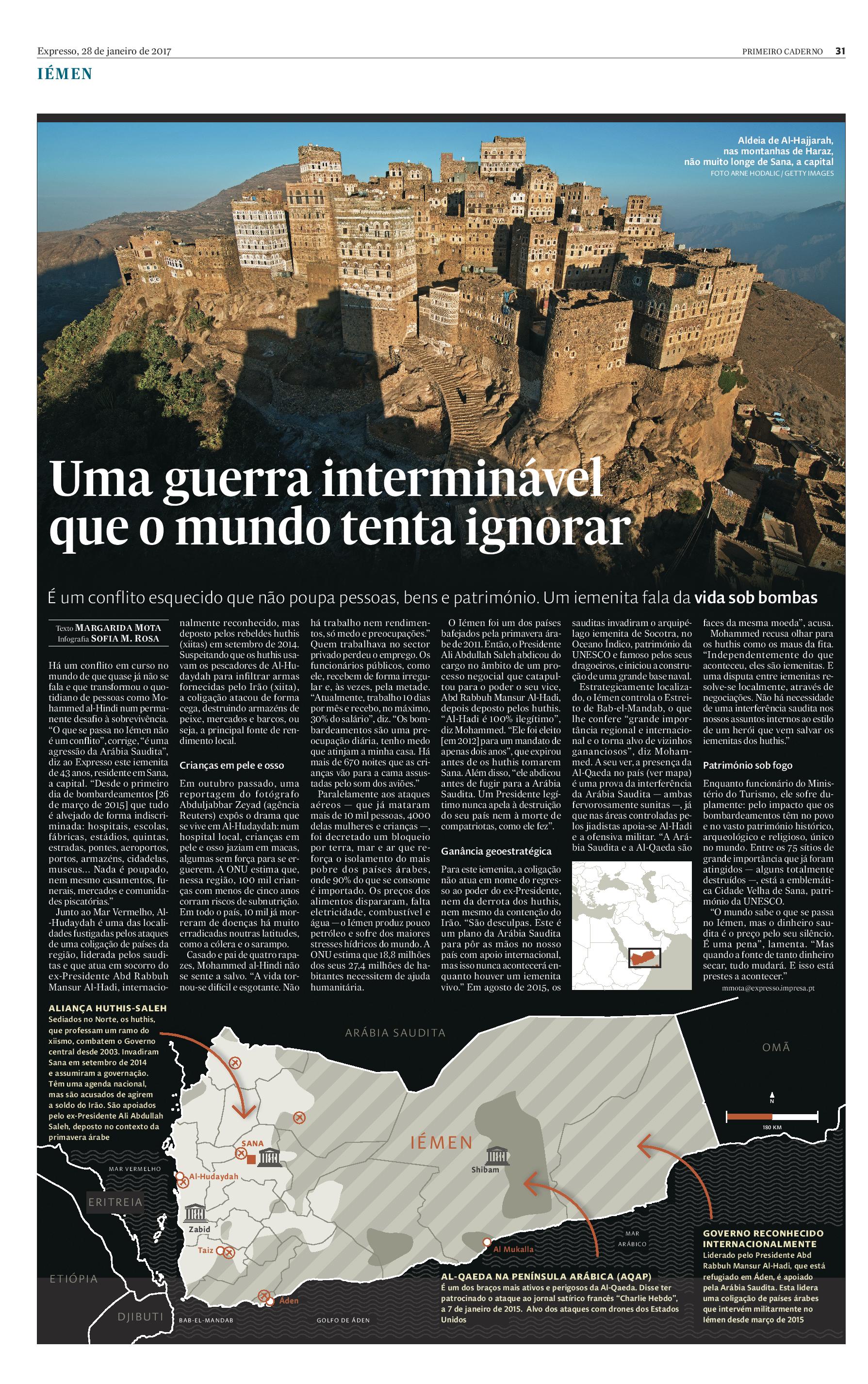 Há um conflito em curso no mundo de que quase já não se fala e que transformou o quotidiano de pessoas como Mohammed al-Hindi num permanente desafio à sobrevivência. “O que se passa no Iémen não é um conflito”, corrige, “é uma agressão da Arábia Saudita”, diz ao “Expresso” este iemenita de 43 anos, residente em Sana’a, a capital. “Desde o primeiro dia de bombardeamentos [26 de março de 2015] que tudo é alvejado de forma indiscriminada: hospitais, escolas, fábricas, estádios, quintas, estradas, pontes, aeroportos, portos, armazéns, cidadelas, museus… Nada é poupado, nem mesmo casamentos, funerais, mercados e comunidades piscatórias.”
