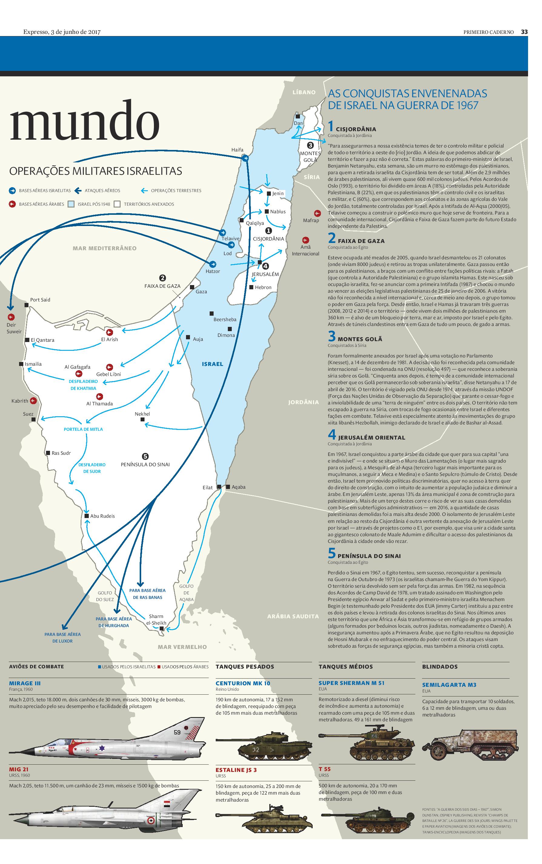CONQUISTADA À JORDÂNIA — “Para assegurarmos a nossa existência temos de ter o controlo militar e policial de todo o território a oeste do [rio] Jordão. A ideia de que podemos abdicar de território e fazer a paz não é correta.” Estas palavras do primeiro-ministro de Israel, Benjamin Netanyahu, esta semana, são um murro no estômago dos palestinianos, para quem a retirada israelita da Cisjordânia tem de ser total. Além de 2,9 milhões de árabes palestinianos, ali vivem quase 600 mil colonos judeus. Pelos Acordos de Oslo (1993), o território foi dividido em áreas A (18%), controladas pela Autoridade Palestiniana, B (22%), em que os palestinianos têm o controlo civil e os israelitas o militar, e C (60%), que correspondem aos colonatos e às zonas agrícolas do Vale do Jordão, totalmente controladas por Israel. Após a Intifada de Al-Aqsa (2000/05), Telavive começou a construir o polémico muro que hoje serve de fronteira. Para a comunidade internacional, Cisjordânia e Faixa de Gaza fazem parte do futuro Estado independente da Palestina.