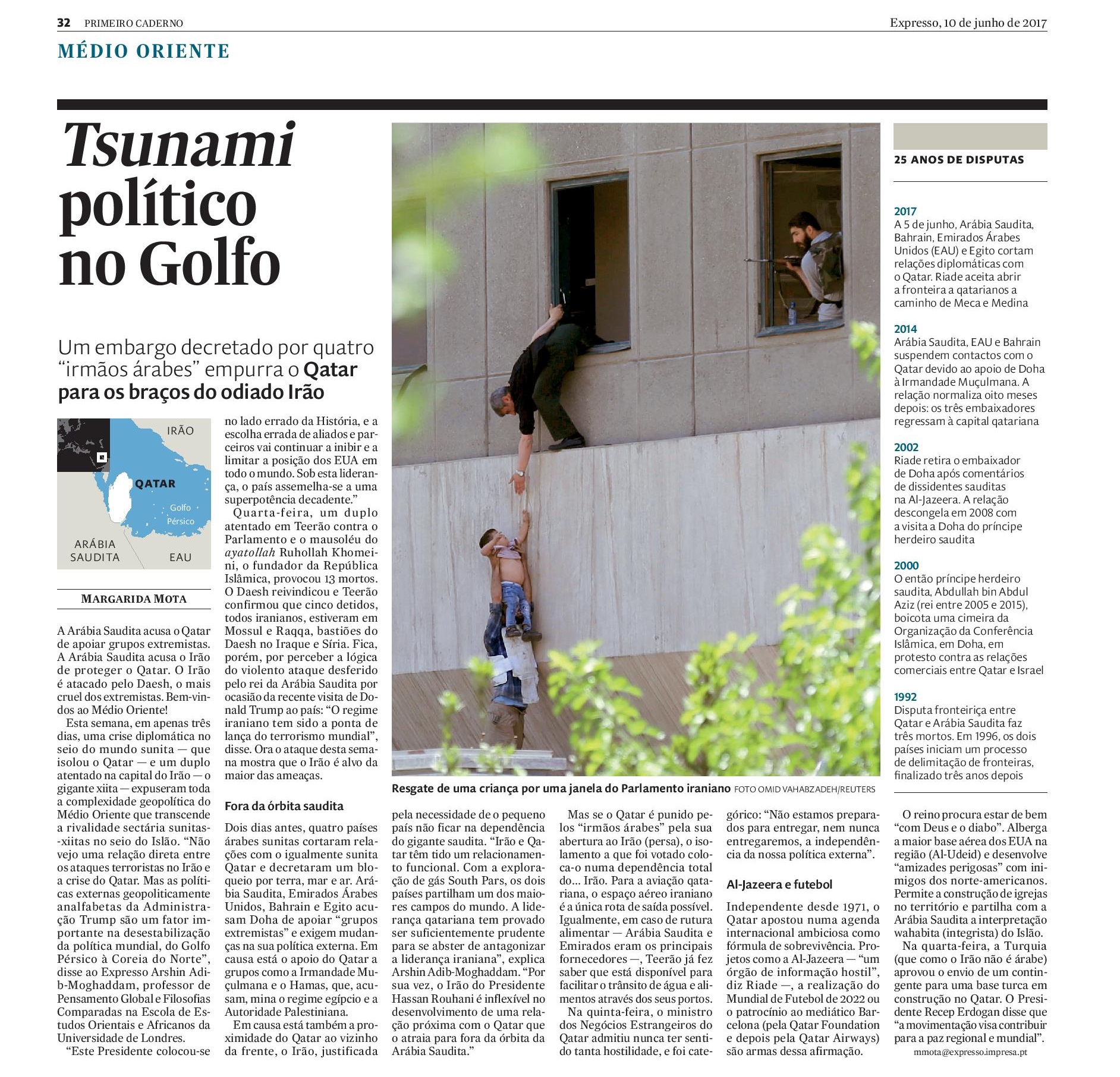 Esta semana, em apenas três dias, uma crise diplomática no seio do mundo sunita — que isolou o Qatar — e um duplo atentado na capital do Irão — o gigante xiita — expuseram toda a complexidade geopolítica do Médio Oriente que transcende a rivalidade sectária sunitas-xiitas no seio do Islão. “Não vejo uma relação direta entre os ataques terroristas no Irão e a crise sobre o Qatar. Mas as políticas externas geopoliticamente analfabetas da Administração Trump são um factor importante na desestabilização da política mundial, do Golfo Pérsico à Coreia do Norte”, disse ao “Expresso” Arshin Adib-Moghaddam, professor de Pensamento Global e Filosofias Comparadas na Escola de Estudos Orientais e Africanos da Universidade de Londres.