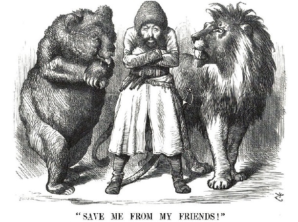 “Salvem-me dos meus amigos!”, lê-se neste cartoon de 1878 sobre “O Grande Jogo” no Afeganistão: O emir afegão Sher Ali Khan ladeado pelo urso russo e pelo leão britânico WIKIMEDIA COMMONS