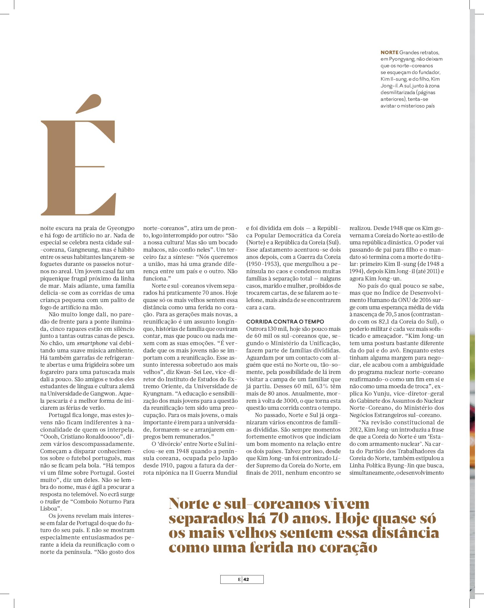 Os jovens revelam mais interesse em falar de Portugal do que do futuro do seu país. E não se mostram especialmente entusiasmados perante a ideia da reunificação com o norte da península. “Não gosto dos norte-coreanos”, atira um de pronto, logo interrompido por outro: “São a nossa cultura! Mas são um bocado malucos, não confio neles”. Um terceiro faz a síntese: “Nós queremos a união, mas há uma grande diferença entre um país e o outro. Não funciona.”