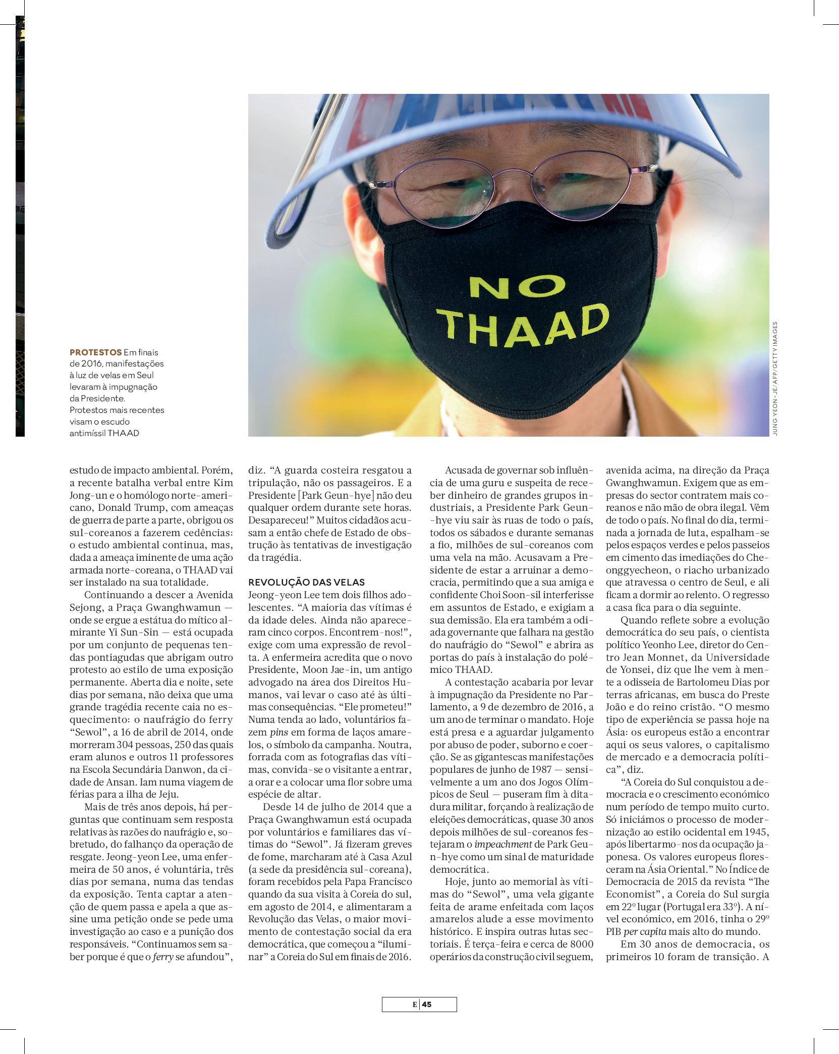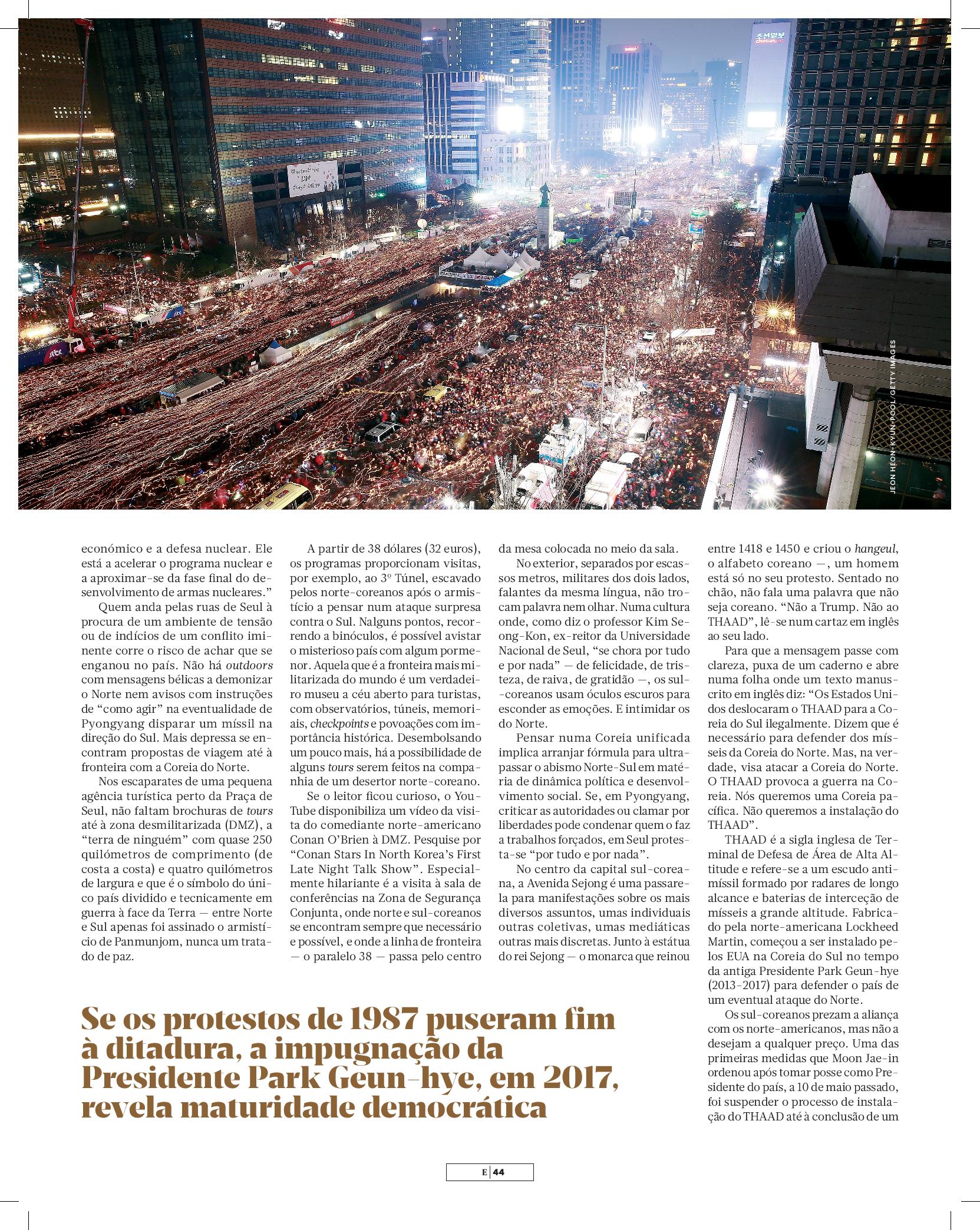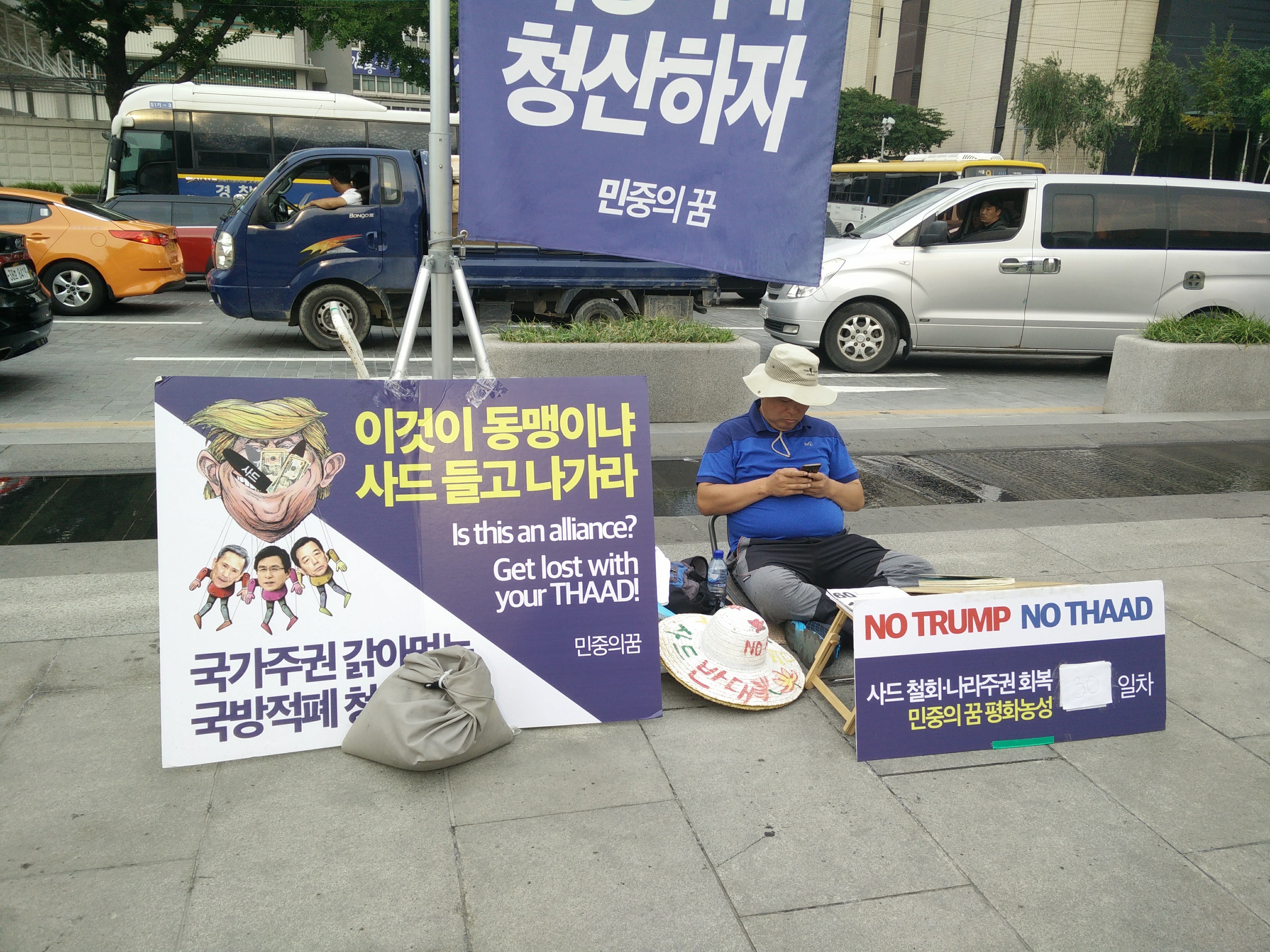 No centro da capital sul-coreana, a Avenida Sejong é uma passarela para manifestações sobre os mais diversos assuntos, umas individuais outras coletivas, umas mediáticas outras mais discretas. Junto à estátua do rei Sejong — o monarca que reinou entre 1418 e 1450 e criou o hangeul, o alfabeto coreano —, um homem está só no seu protesto. Sentado no chão, não fala uma palavra que não seja coreano. “Não a Trump. Não ao THAAD”, lê-se num cartaz em inglês ao seu lado.