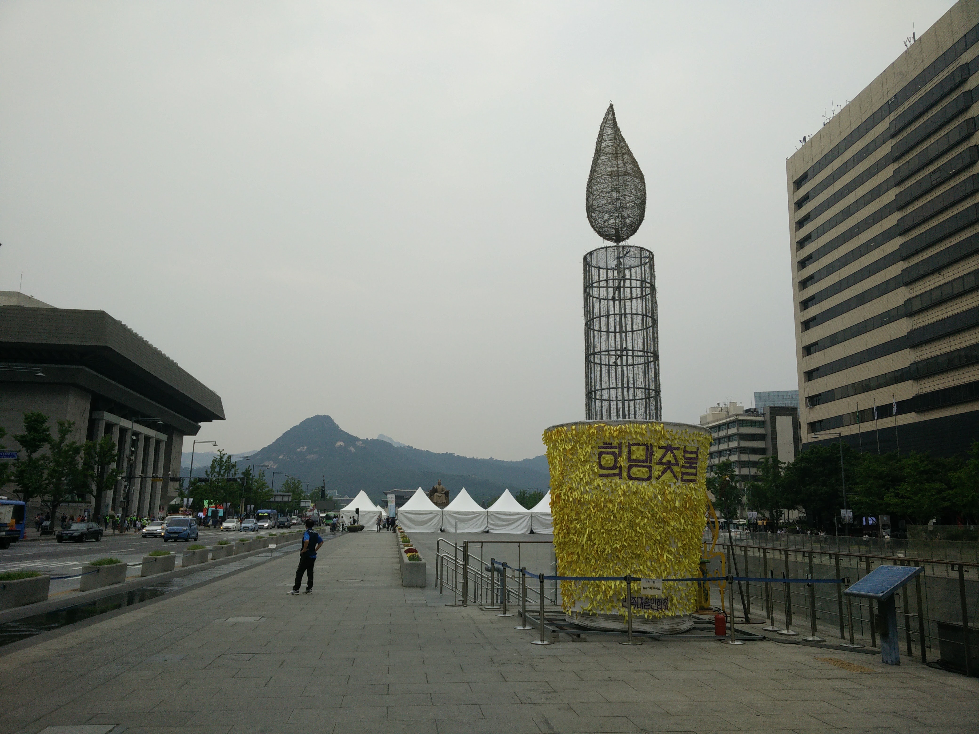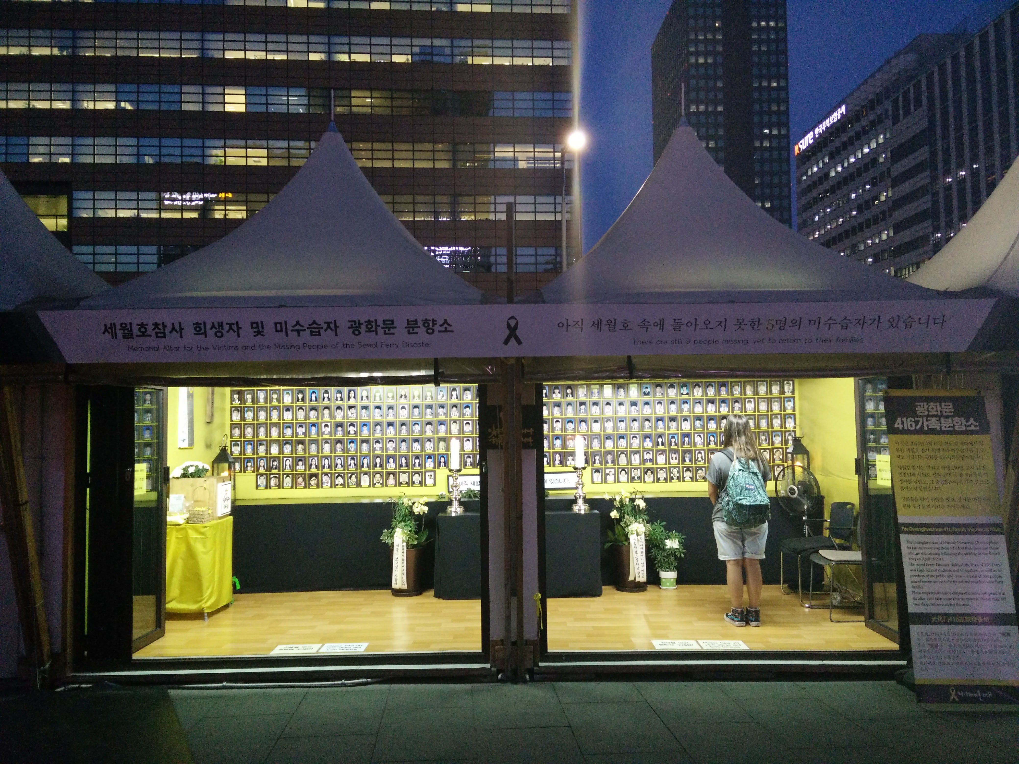 Continuando a descer a Avenida Sejong, a Praça Gwanghwamun — onde se ergue a estátua do mítico almirante Yi Sun-Sin — está ocupada por um conjunto de pequenas tendas pontiagudas que abrigam outro protesto ao estilo de uma exposição permanente. Aberta dia e noite, sete dias por semana, não deixa que uma grande tragédia recente caia no esquecimento: o naufrágio do ferry “Sewol”, a 16 de abril de 2014, onde morreram 304 pessoas, 250 das quais eram alunos e outros 11 professores na Escola Secundária Danwon, da cidade de Ansan. Iam numa viagem de férias para a ilha de Jeju.