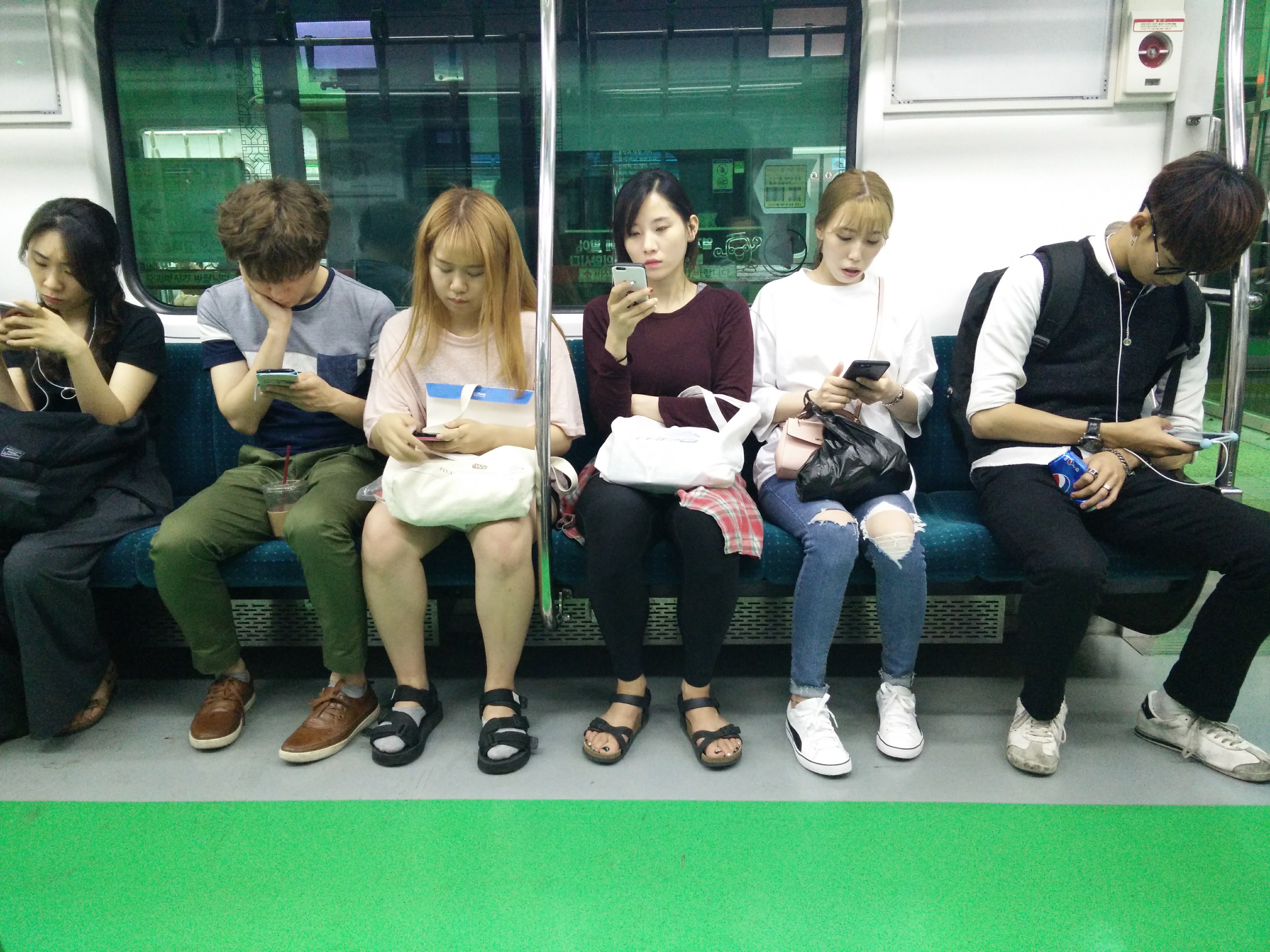 Seis jovens viajam no metro de Seul, cada qual agarrado ao seu “smartphone” MARGARIDA MOTA