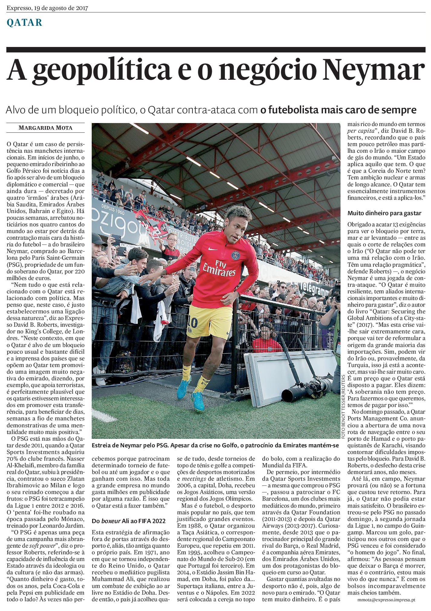 “Nem tudo o que está relacionado com o Qatar está relacionado com política. Mas penso que, neste caso, é justo estabelecermos uma ligação dessa natureza”, diz ao Expresso David B. Roberts, investigador no King’s College, de Londres. “Neste contexto, em que o Qatar é alvo de um bloqueio pouco usual e bastante difícil e a imprensa dos países que se opõem ao Qatar tem promovido uma imagem muito negativa do emirado, dizendo, por exemplo, que apoia terroristas, é perfeitamente plausível que os qataris estivessem interessados em promover esta transferência, para beneficiar de dias, semanas a fio de manchetes demonstrativas de uma mentalidade muito mais positiva.”