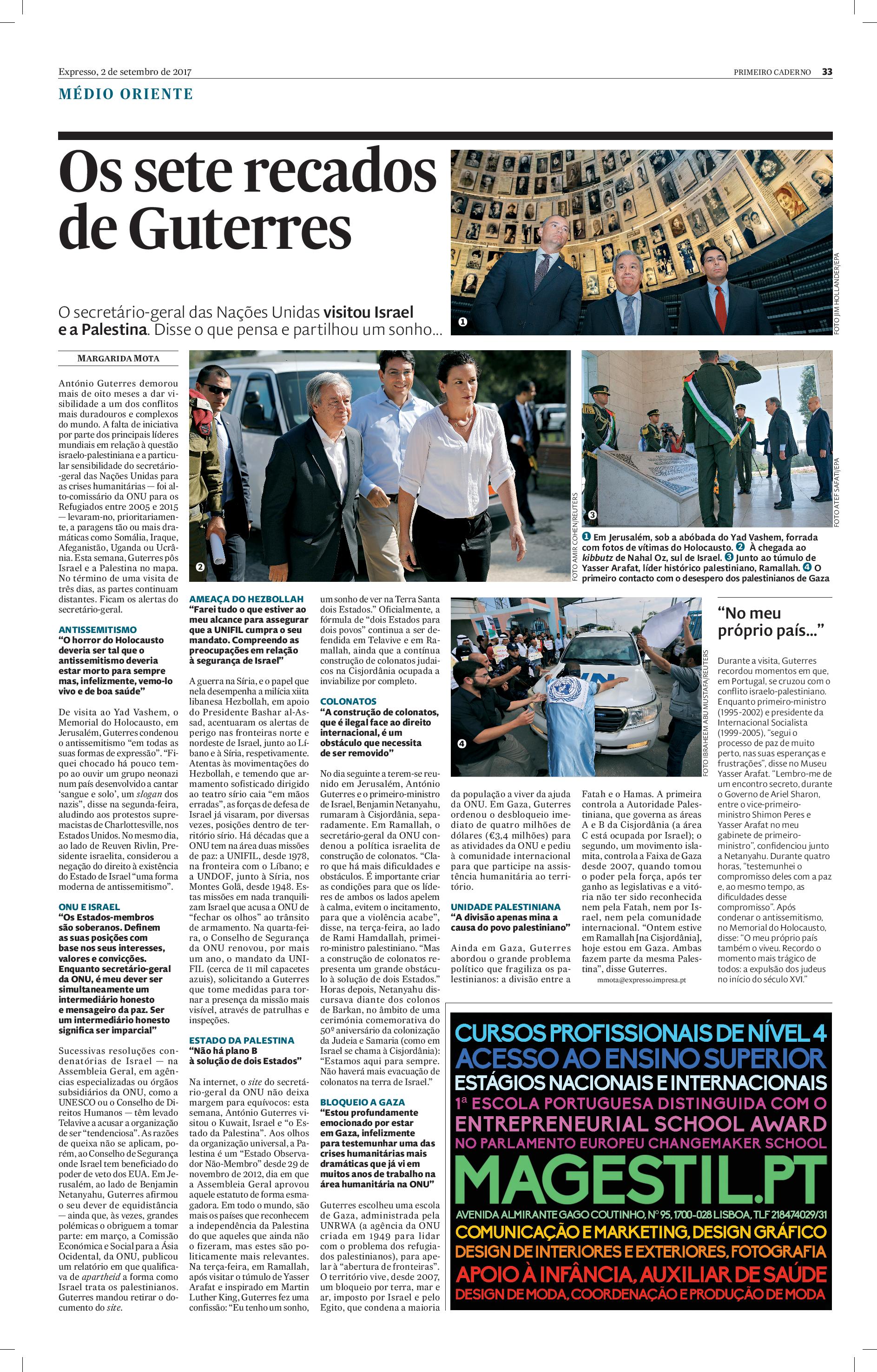 Durante a visita, Guterres recordou momentos em que, em Portugal, se cruzou com o conflito israelo-palestiniano. Enquanto primeiro-ministro (1995-2002) e presidente da Internacional Socialista (1999-2005), “segui o processo de paz de muito perto, nas suas esperanças e frustrações”, disse no Museu Yasser Arafat. “Lembro-me de um encontro secreto, durante o Governo de Ariel Sharon, entre o vice-primeiro-ministro Shimon Peres e Yasser Arafat no meu gabinete de primeiroministro”, confidenciou junto a Netanyahu. Durante quatro horas, “testemunhei o compromisso deles com a paz e, ao mesmo tempo, as dificuldades desse compromisso”. Após condenar o antissemitismo, no Memorial do Holocausto, disse: “O meu próprio país também o viveu. Recordo o momento mais trágico de todos: a expulsão dos judeus no início do século XVI”.
