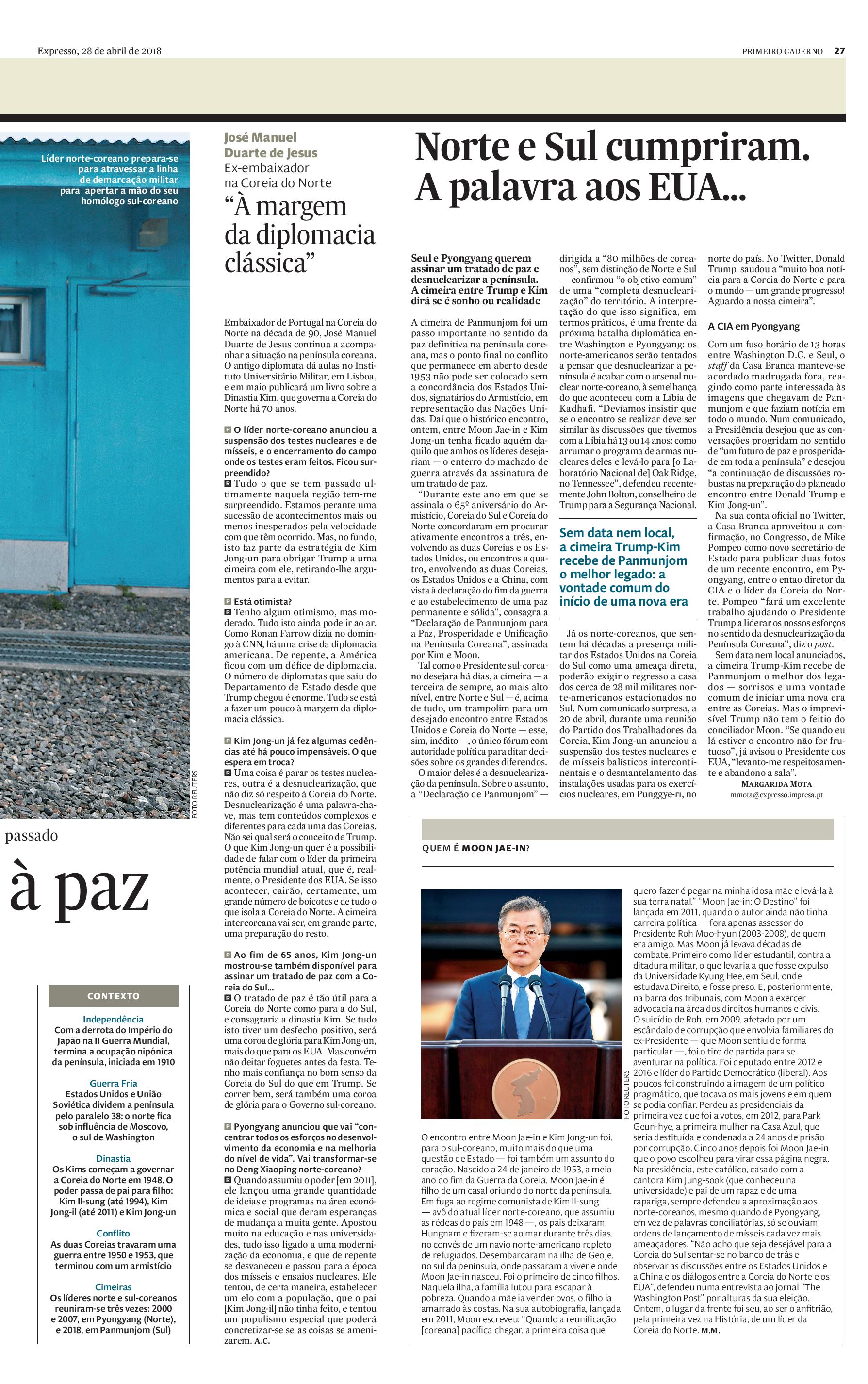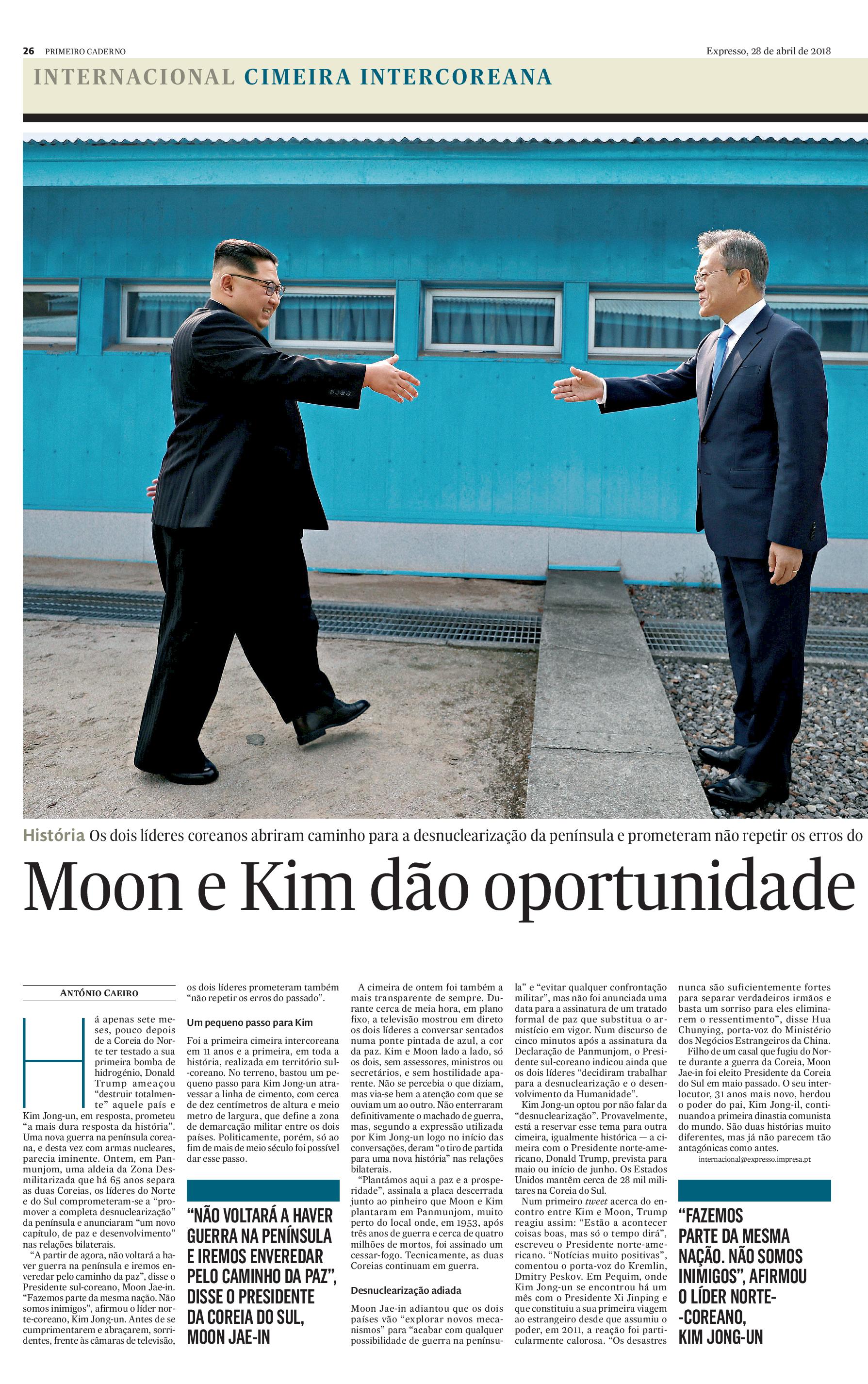 Sem data nem local anunciados, a cimeira Trump-Kim recebe de Panmunjom o melhor dos legados — sorrisos e uma vontade comum de iniciar uma nova era entre as Coreias. Mas o imprevisível Trump não tem o feitio do conciliador Moon. “Se quando eu lá estiver o encontro não for frutuoso”, já avisou o Presidente dos EUA, “levanto-me respeitosamente e abandono a sala”.